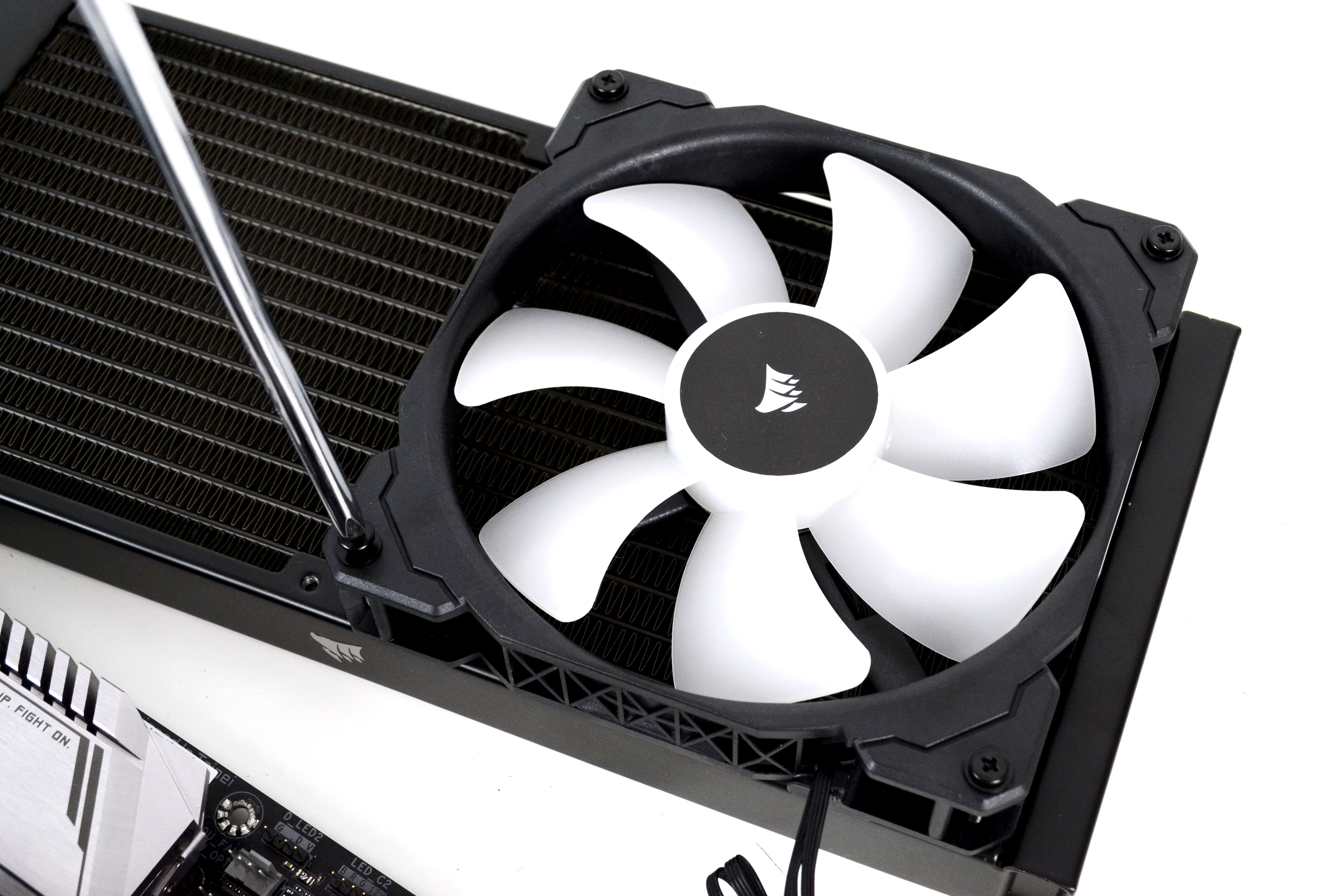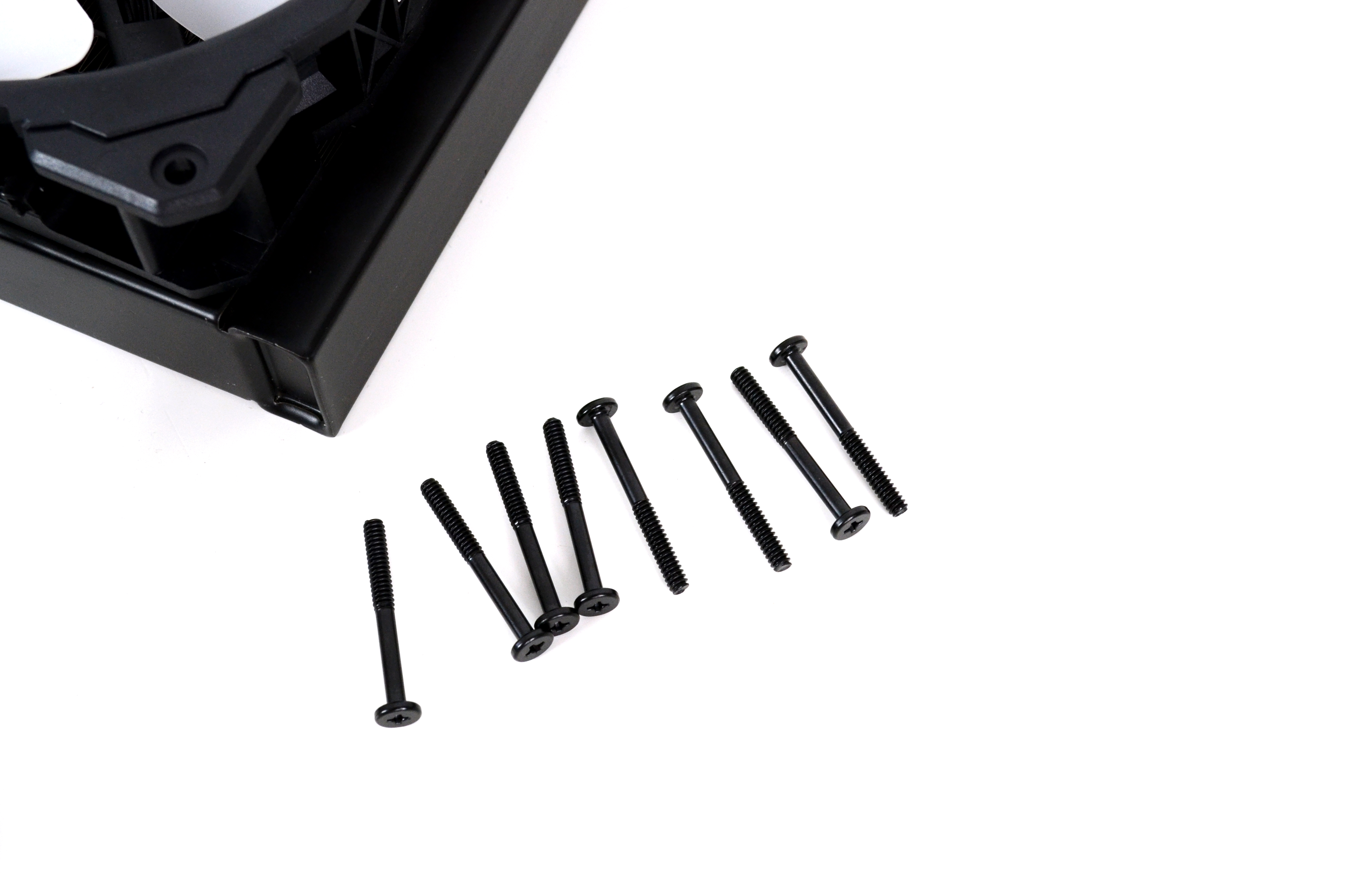 Now would be a good time to choose the location of the radiator inside your case. Mounting the cooler on our test bench is a little different to mounting inside a case so we can fit the fans to the radiator now using the long black screws and washers provided.