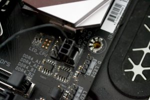 With the motherboard and cooler installed on our test bench, we can move on to connecting up all the cables. First, connect the 3-pin pump tach cable to the motherboard CPU_FAN header, then connect the large multi-pin connector from the CPU block to the Corsair Commander Core RGB controller as shown.