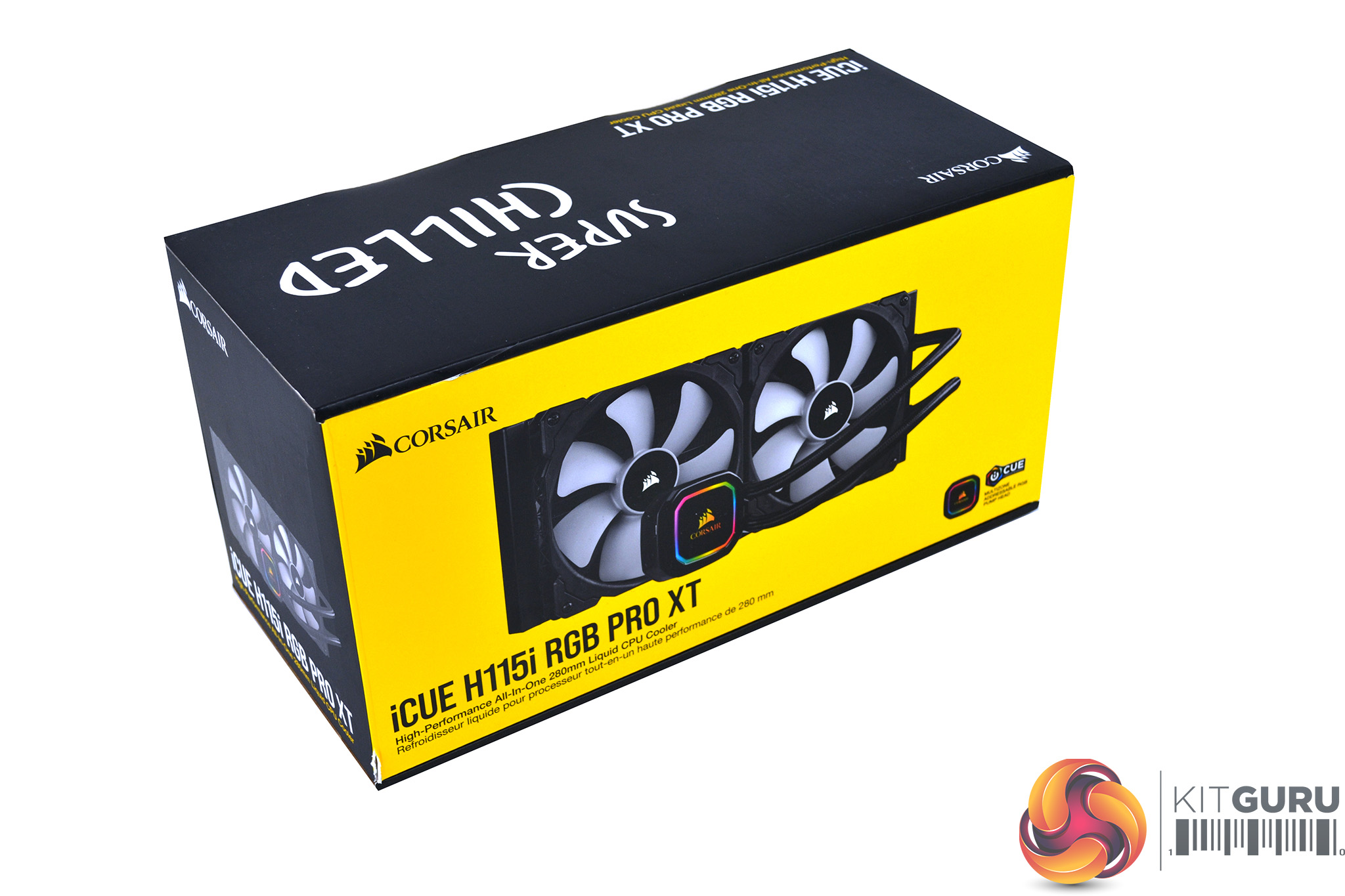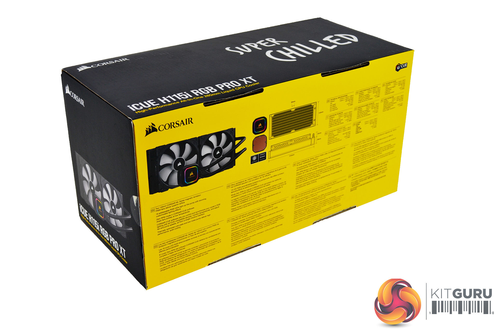 Corsair has packaged the iCUE H115i RGB PRO XT in a substantial cardboard box featuring the traditional black and yellow company colour scheme. On the front of the box is a large image of the cooler with Corsair branding printed in the corners. On the rear is a list of technical specifications, as well as images showing dimensions.
