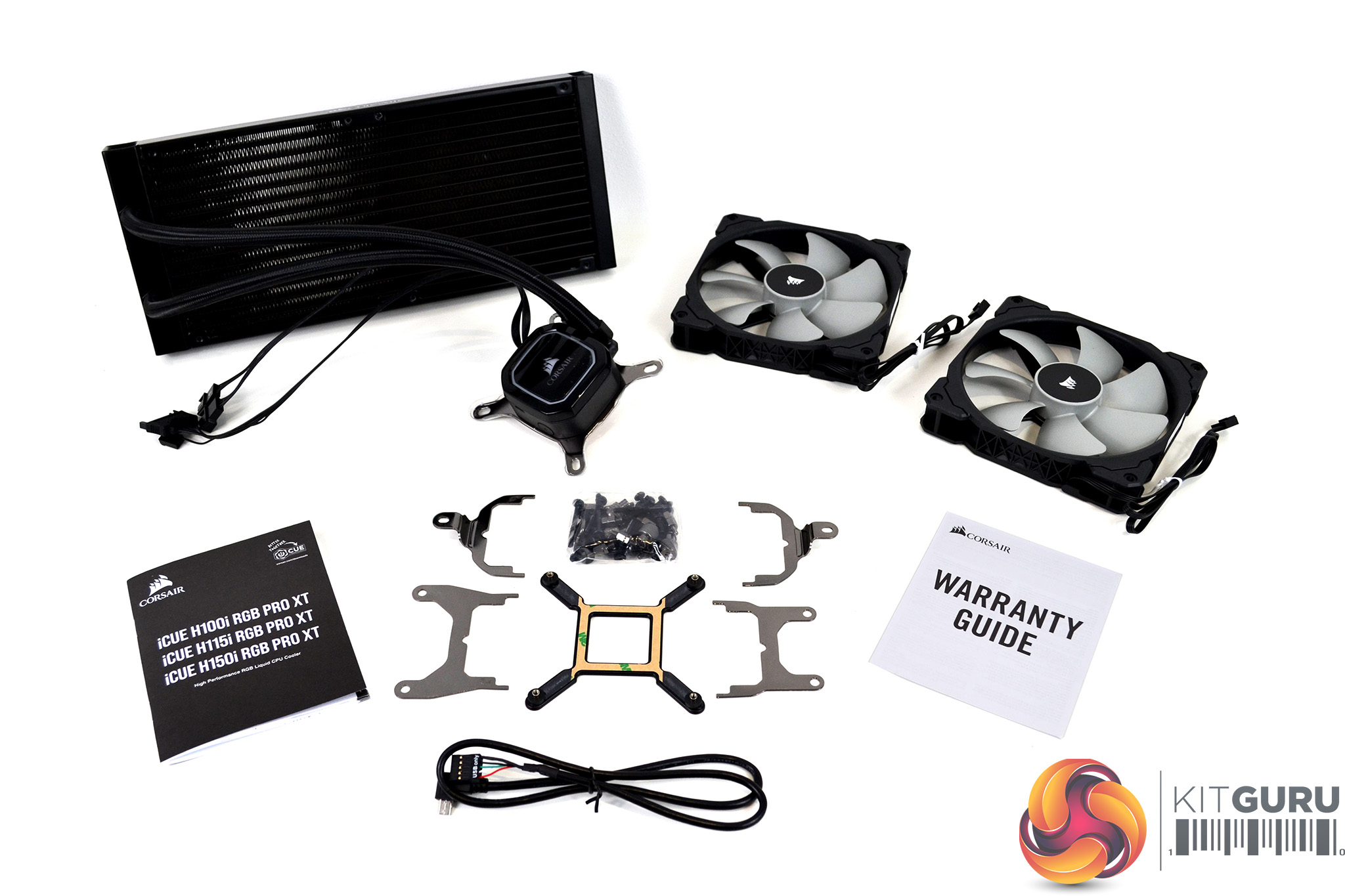Inside the box is an additional layer of protective cardboard packaging along with two Corsair ML140 fans, mounting hardware for Intel and AMD platforms including TR4/TRX40, a USB cable with motherboard header connection, an installation manual, warranty booklet and of course, the cooler itself.