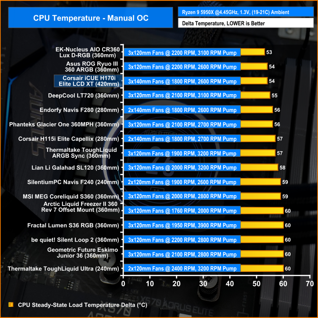 With the fans at maximum RPM, the H170i records an average CPU temperature of 54C. It's up there with some of the best coolers we have tested but is beaten by some of the top performing 360mm units from EK and Asus which is a little disappointing since the H170i has a larger cooling surface area and bigger fans, but it’s still a solid result.