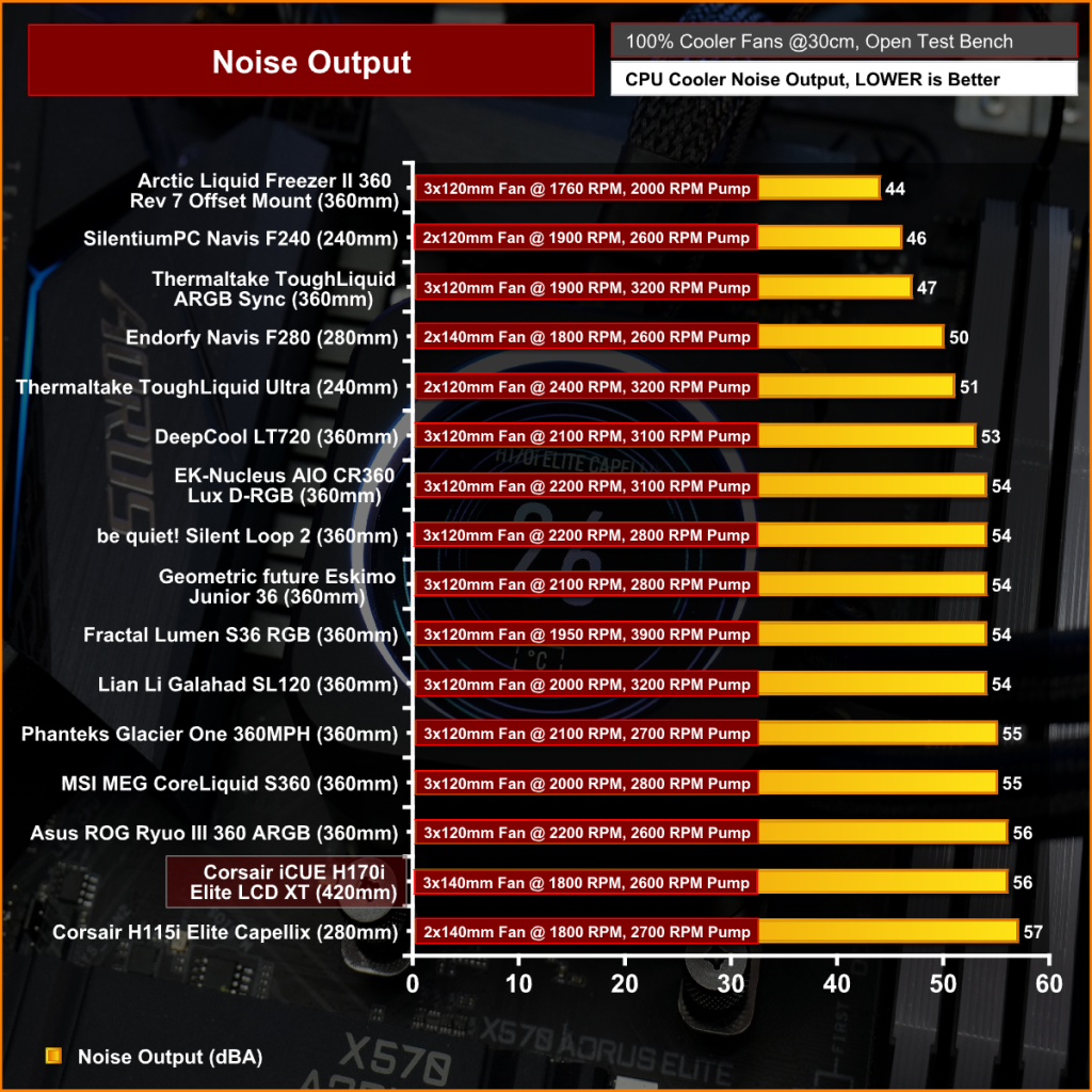 With noise output normalised and limited to 40dBA the H170i Elite LCD XT holds on to its cooling performance and is still up at the top of the chart, but again we see it only performing on par with some of the best 360mm coolers. This again is a good result but a little disappointing considering that this cooler has an increased cooling surface area.