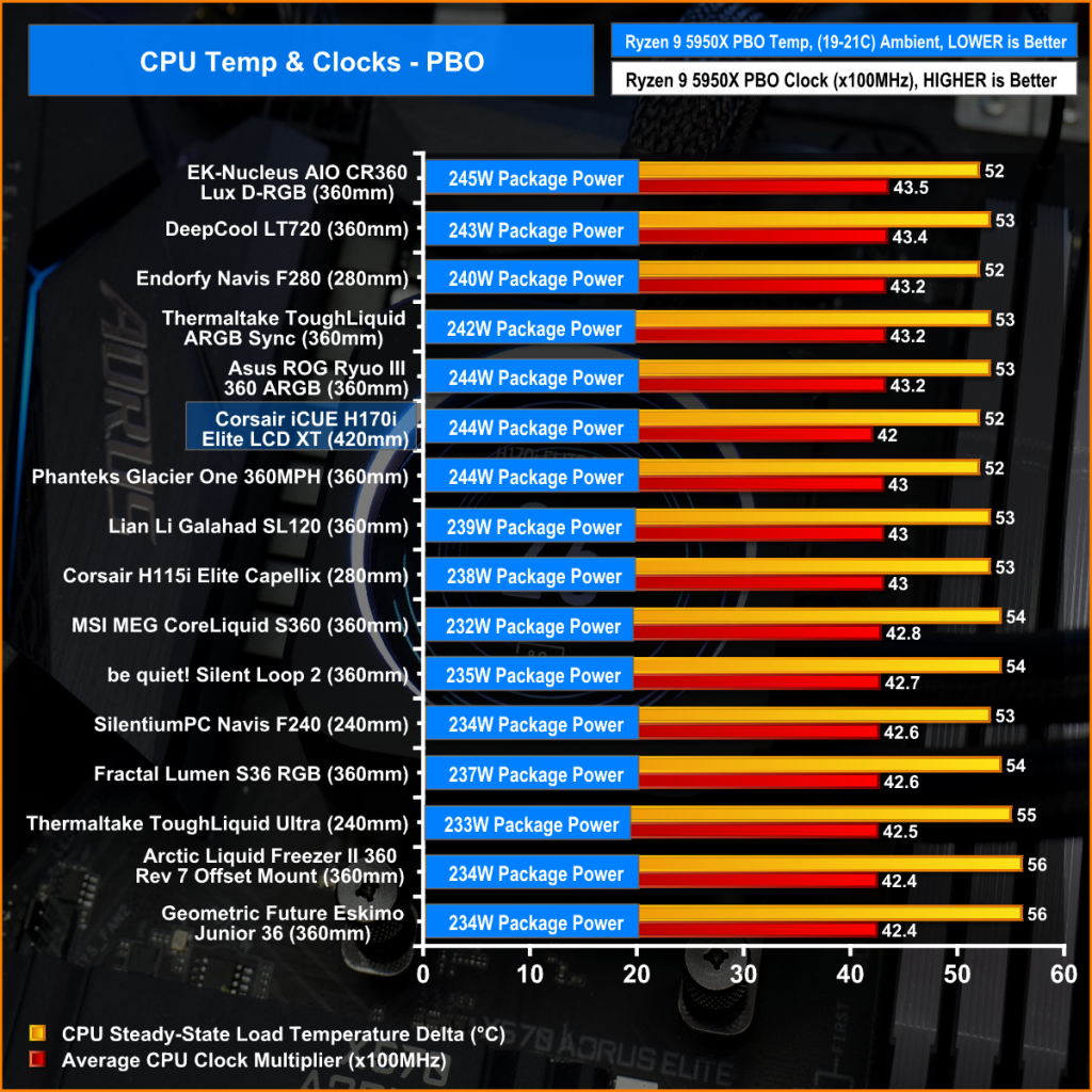 With the PBO test, the most important metrics are the clock multiplier and cooling power as the temperature difference between coolers is slim. The Corsair unit is able to cool 244W of package power and holds on to a 43x average multiplier during the test which is a solid performance, but again it is beaten by other smaller coolers which is a bit disappointing as a higher clock multiplier means more CPU performance.