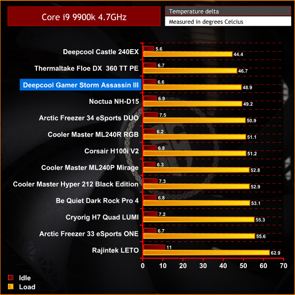 At 4.7GHz, the Assassin III is holding strong and still beating the Noctua NH-D15 by just 0.3°C under 100% load. Again, a couple of degrees hotter than the Thermaltake 360mm AIO. Idle temperature is very good too at 6.6°C.