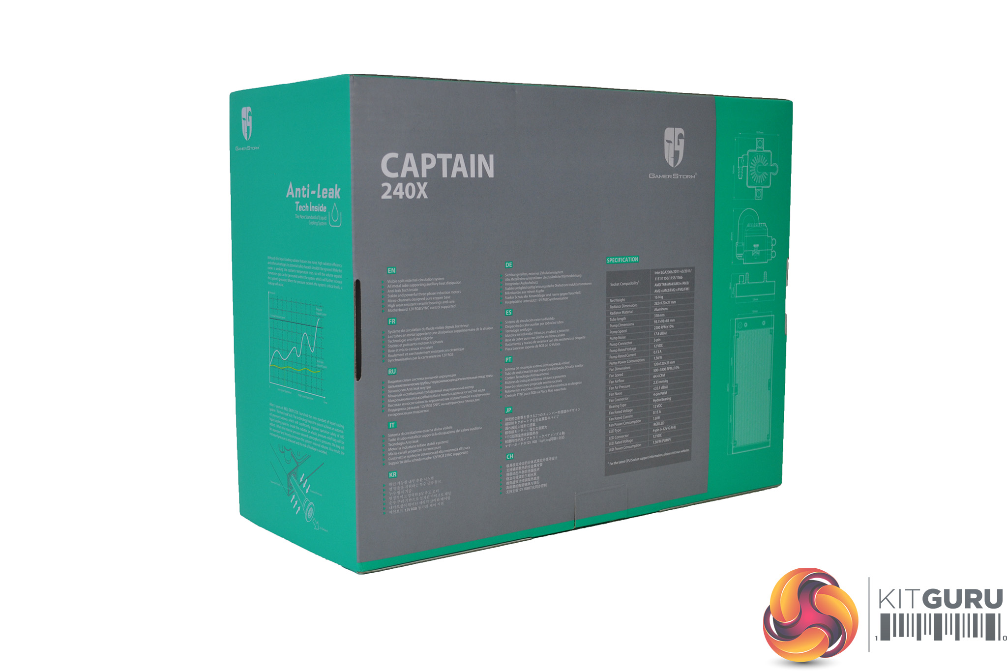 Deepcool has continued with its familiar grey and green theme for the packaging of the Captain 240X. The front of the box sports a large central image of the cooler with references to the Anti-leak technology and compatible RGB sync software in opposite corners. On the rear is a list of key features with diagrams and technical specifications listed too.