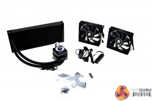 Once everything has been removed from the packaging, we can get a better idea of exactly what is included. Two TF120 S fans, a PWM hub, RGB controller, mounting hardware for both Intel and AMD platforms, along with a Gamer Storm self-adhesive emblem and the cooler itself are in the box.