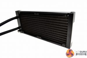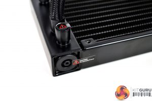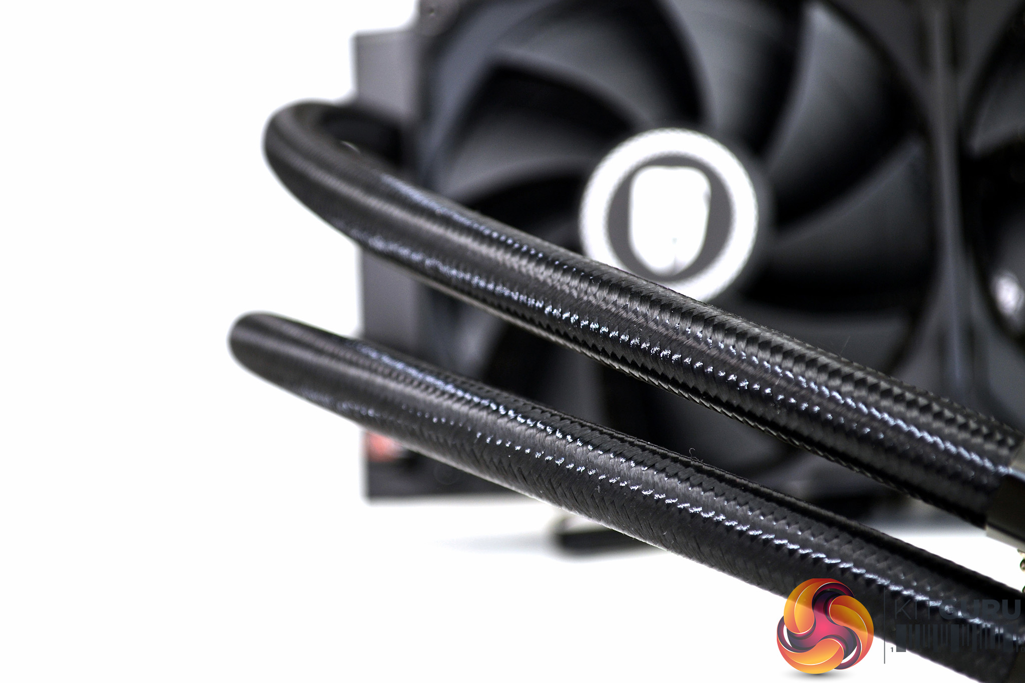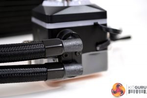 The cooler's tubing is reinforced to prevent kinks when manipulating into place and includes black braided sheathing for a premium finish. On the pump end of both tubes are rotating fittings to assist routing and positioning over the CPU socket.