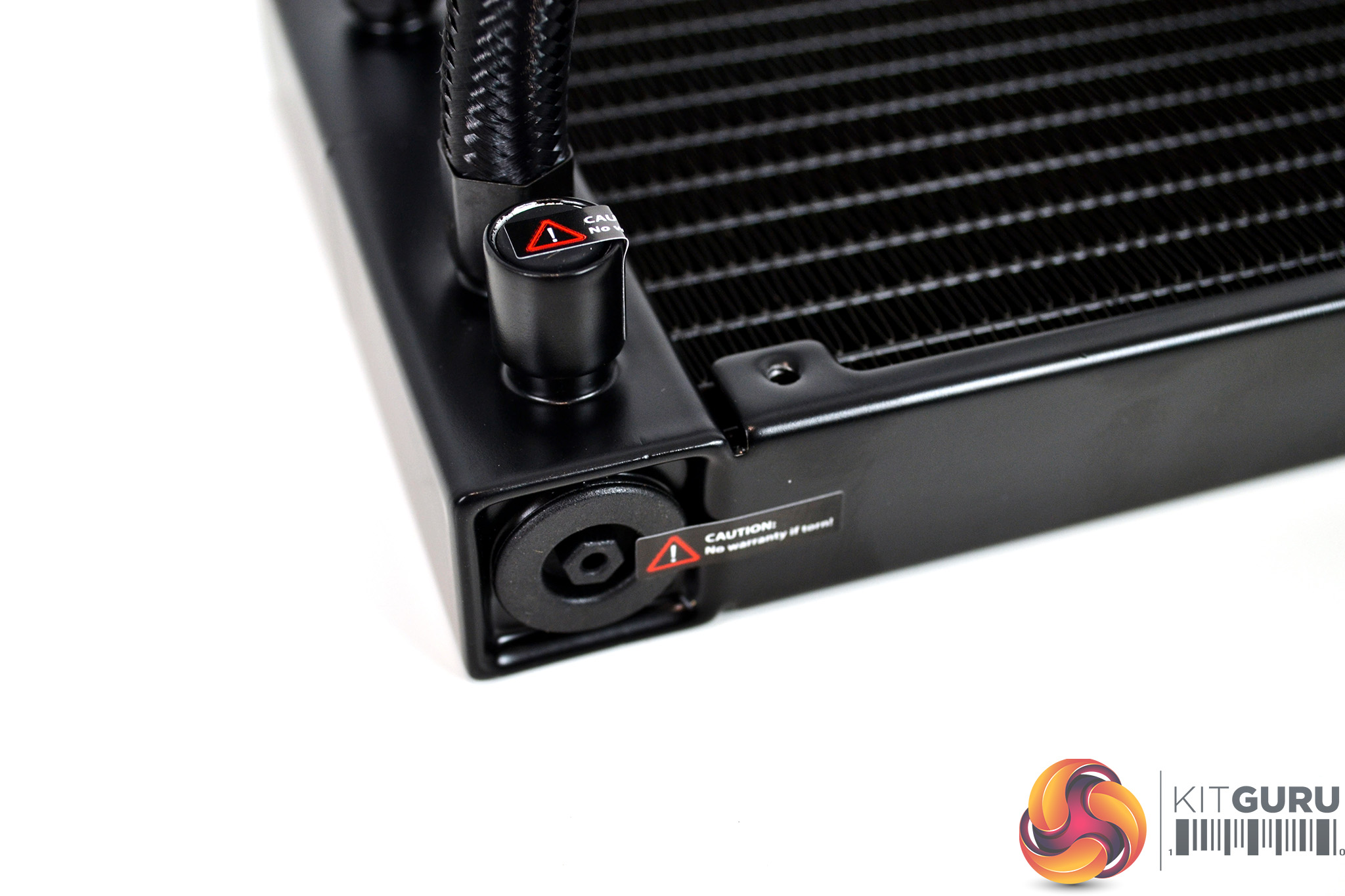 Moving on to the cooler itself, the radiator looks identical to the one used in other recent Deepcool AIOs. It has a smooth and even black coating throughout and in the lower corner under the tubing outlets is the Anti-leak bag, with a caution sticker applied over it.
