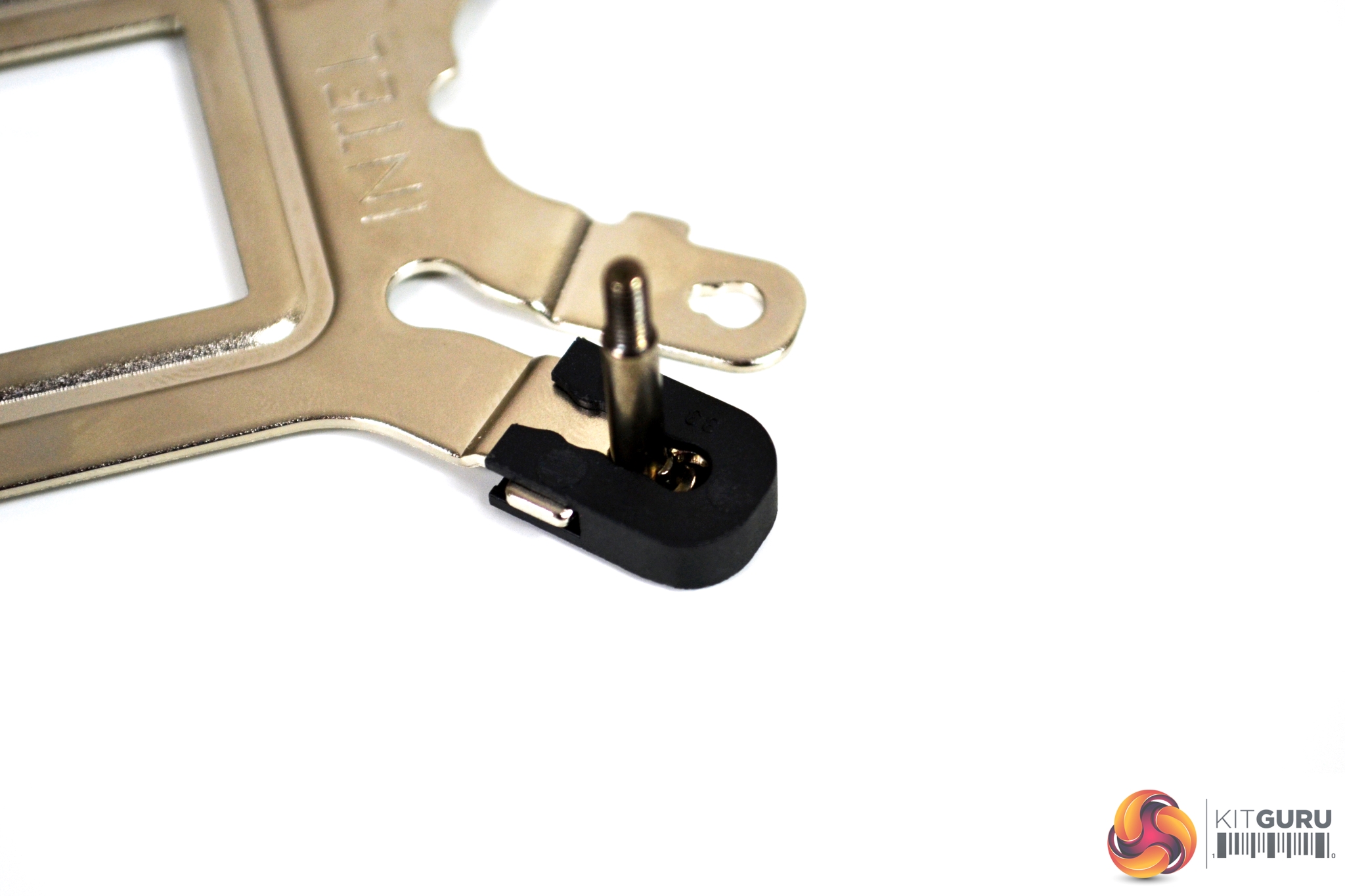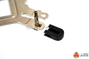At the base of the CPU are mounting holes for the upper retention bracket for both Intel and AMD applications. Align the Intel mounting bracket with the hole in the correct orientation and then use the small silver Philips head screws to fix the upper brackets in position.