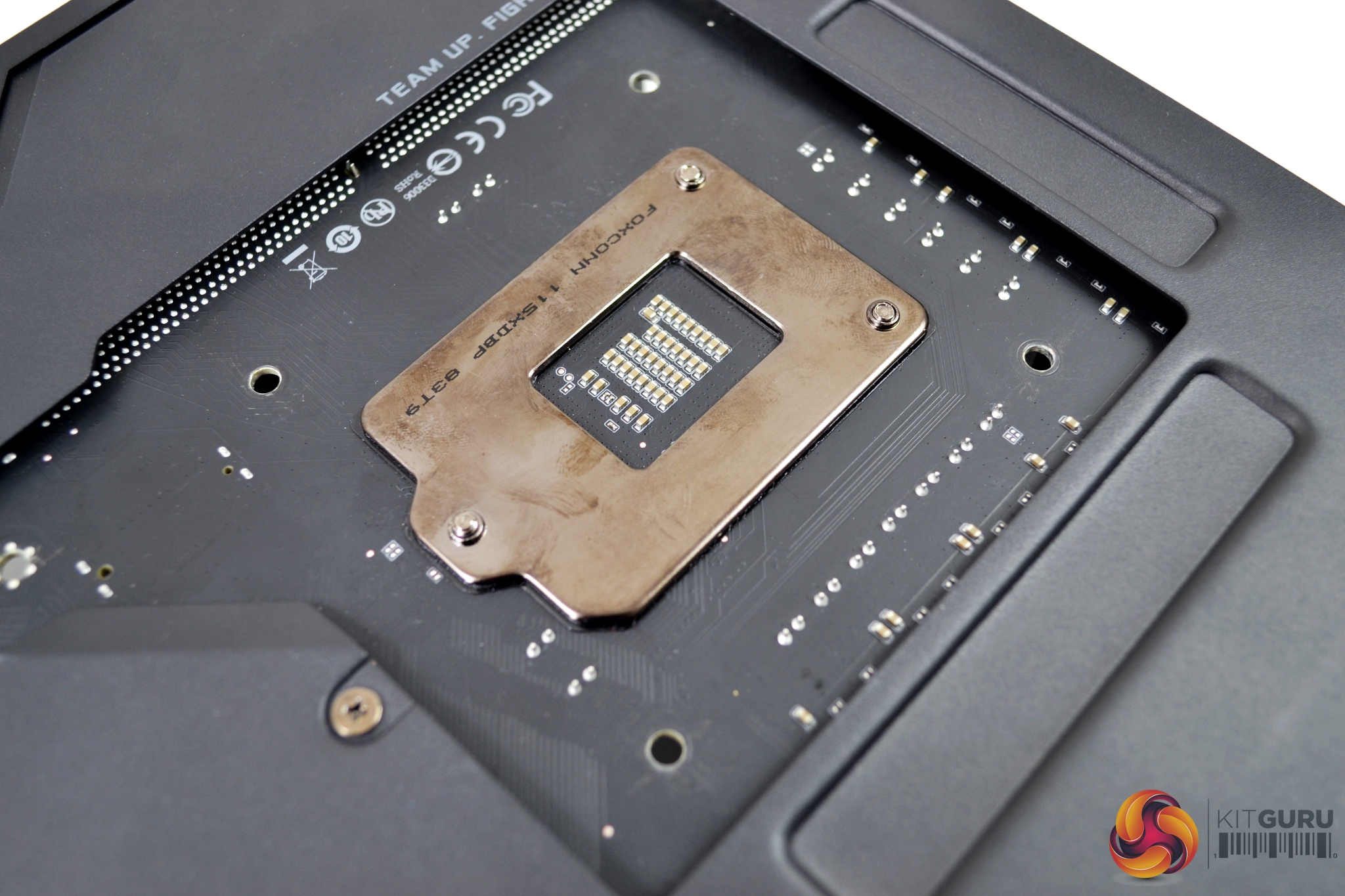 With the motherboard flipped over, align the retention bracket and mounting posts with the holes on the motherboard from the underside and locate the backplate in position. To hold the backplate in position while you flip the motherboard back over, the use of insulating tape could come in handy.
