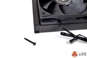 To install the Deepcool Castle 280EX on our test bench we can install the fans to the radiator first. To do this, decide whether to run the fans in either a pull or push configuration (we are using push) and then fix the fans to the radiator using the long black screws provided.
