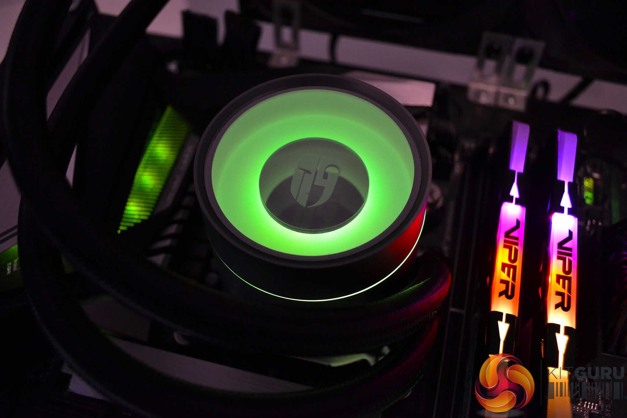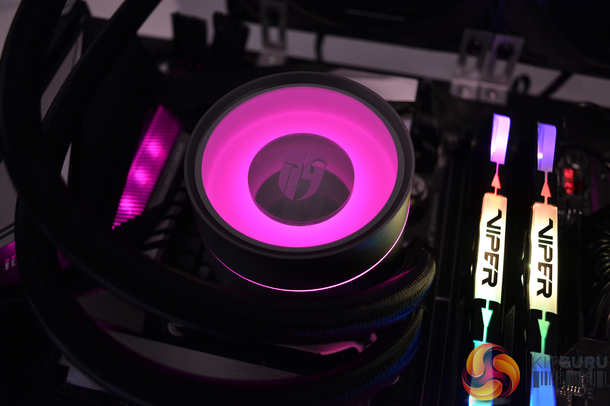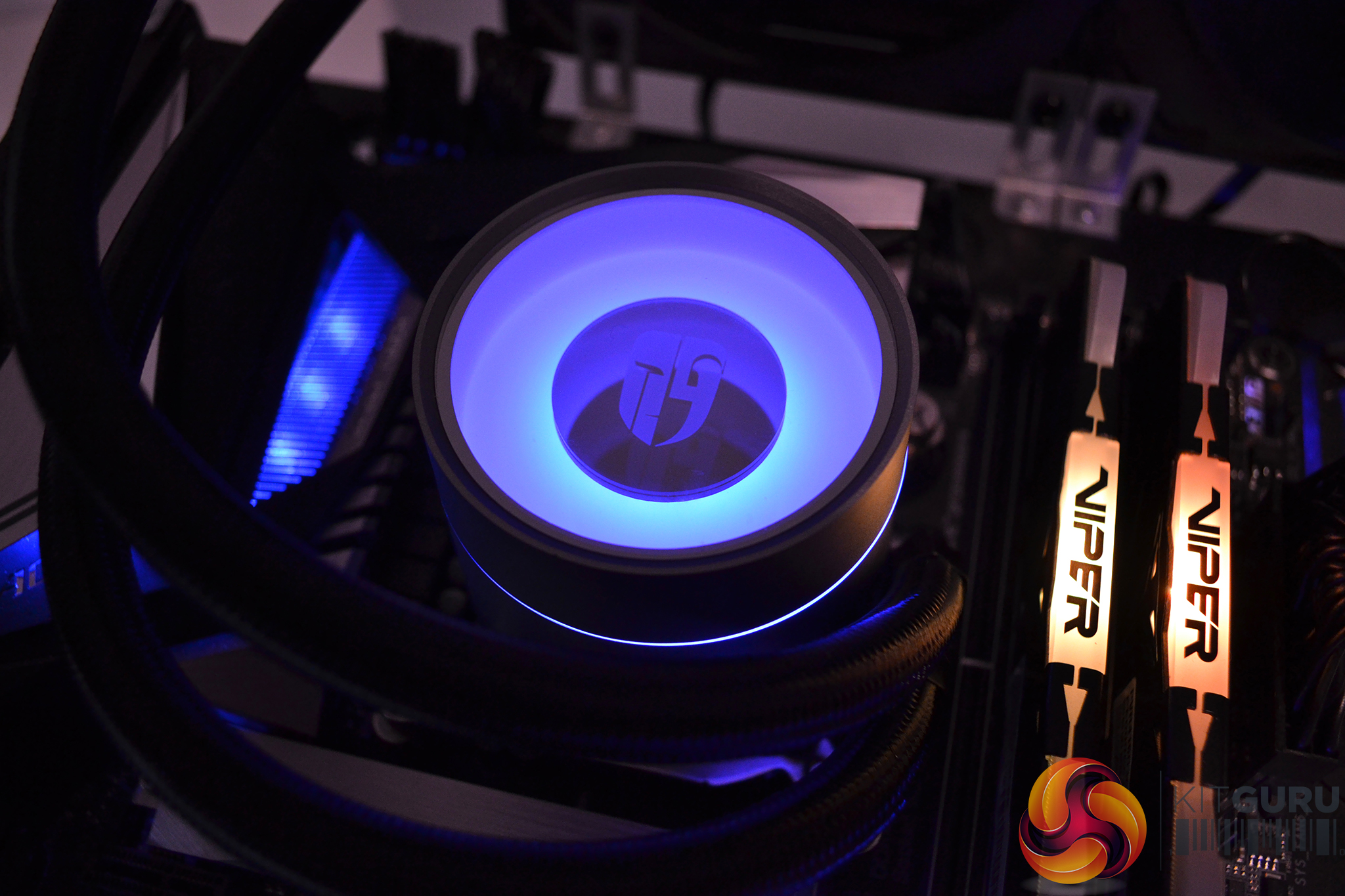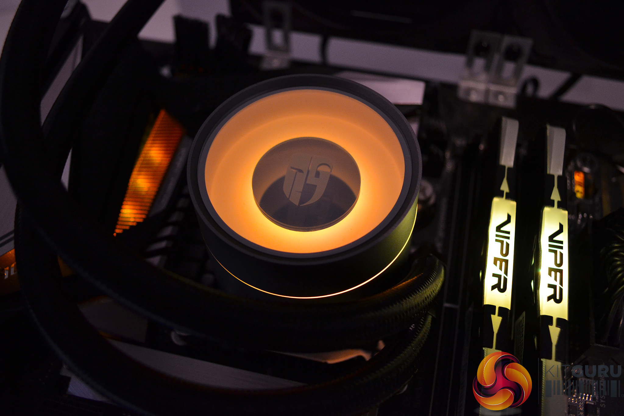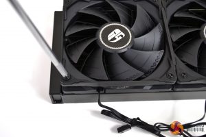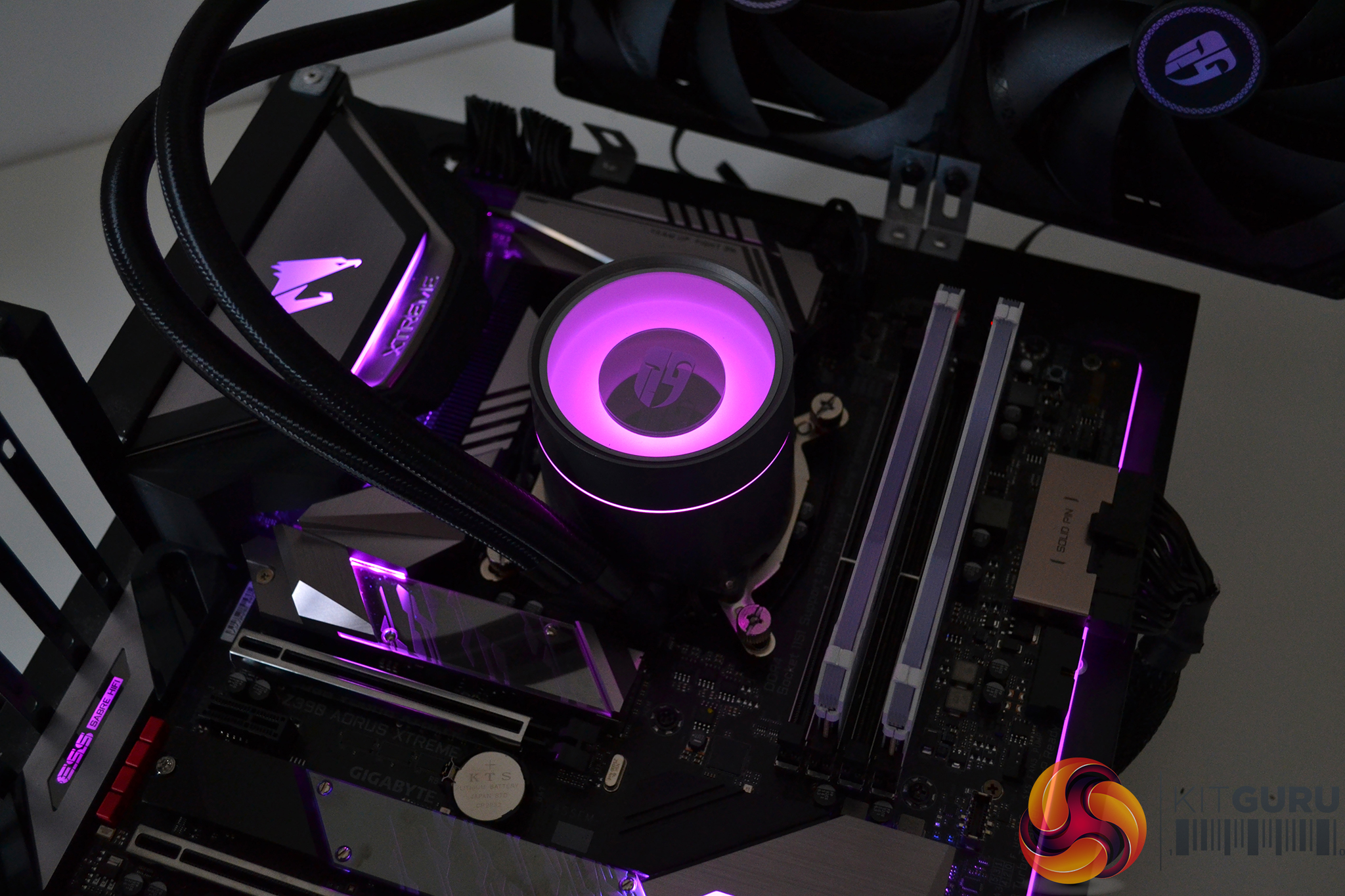 To complete the installation the cables need connecting next. The fans are connected together using the included 4-pin PWM splitter cable and then connected to the motherboard CPU_FAN header. The 3-pin pump power cable connects to the CPU_OPT header on our Gigabyte Z390 Aorus Xtreme motherboard.