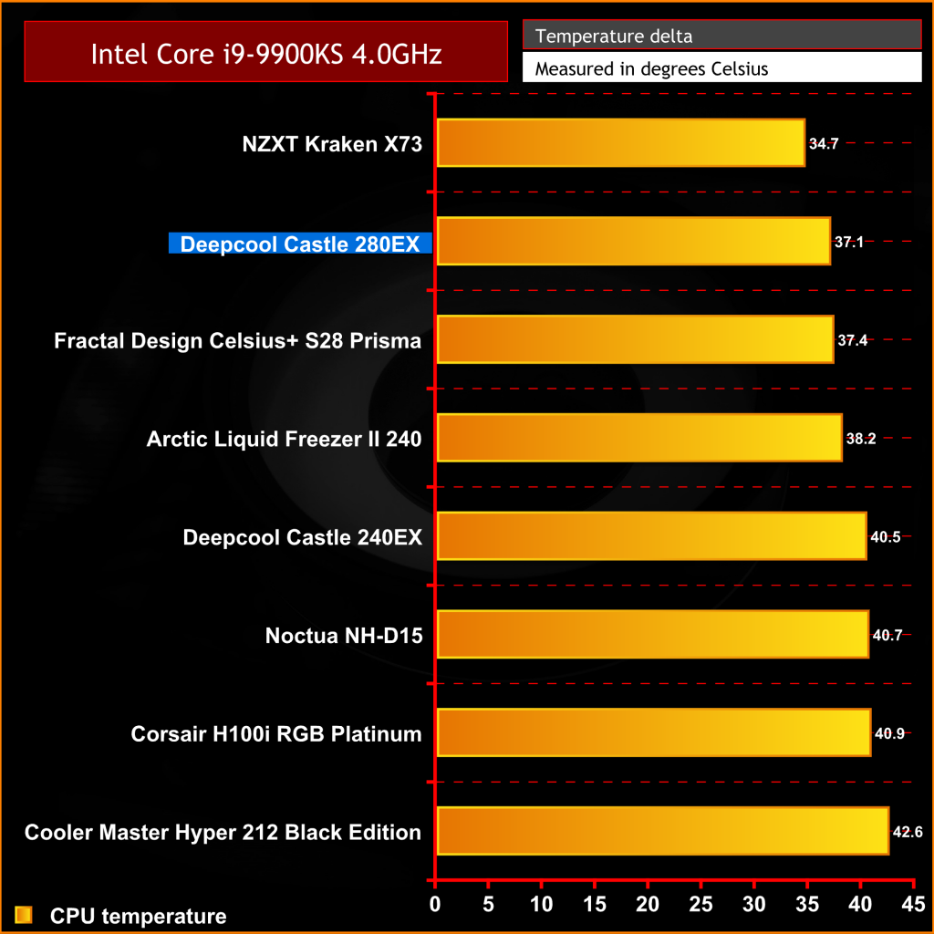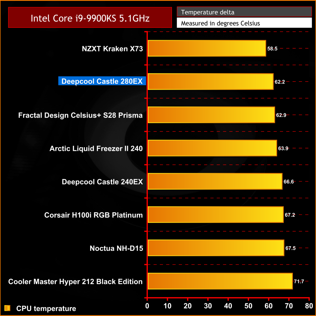In terms of raw thermal performance with the pump and fan speed running at maximum RPM, the Deepcool Castle 280EX performs very well. It produces similar thermal performance to other closed-loop coolers of its size and offers a slight improvement in performance over its smaller brother, the Castle 240EX. Even with the Intel Core i9-9900KS running at an all-core frequency of 5.1 GHz, the Castle 280EX shows it is capable of handling the heat output of a high-end overclocked CPU.