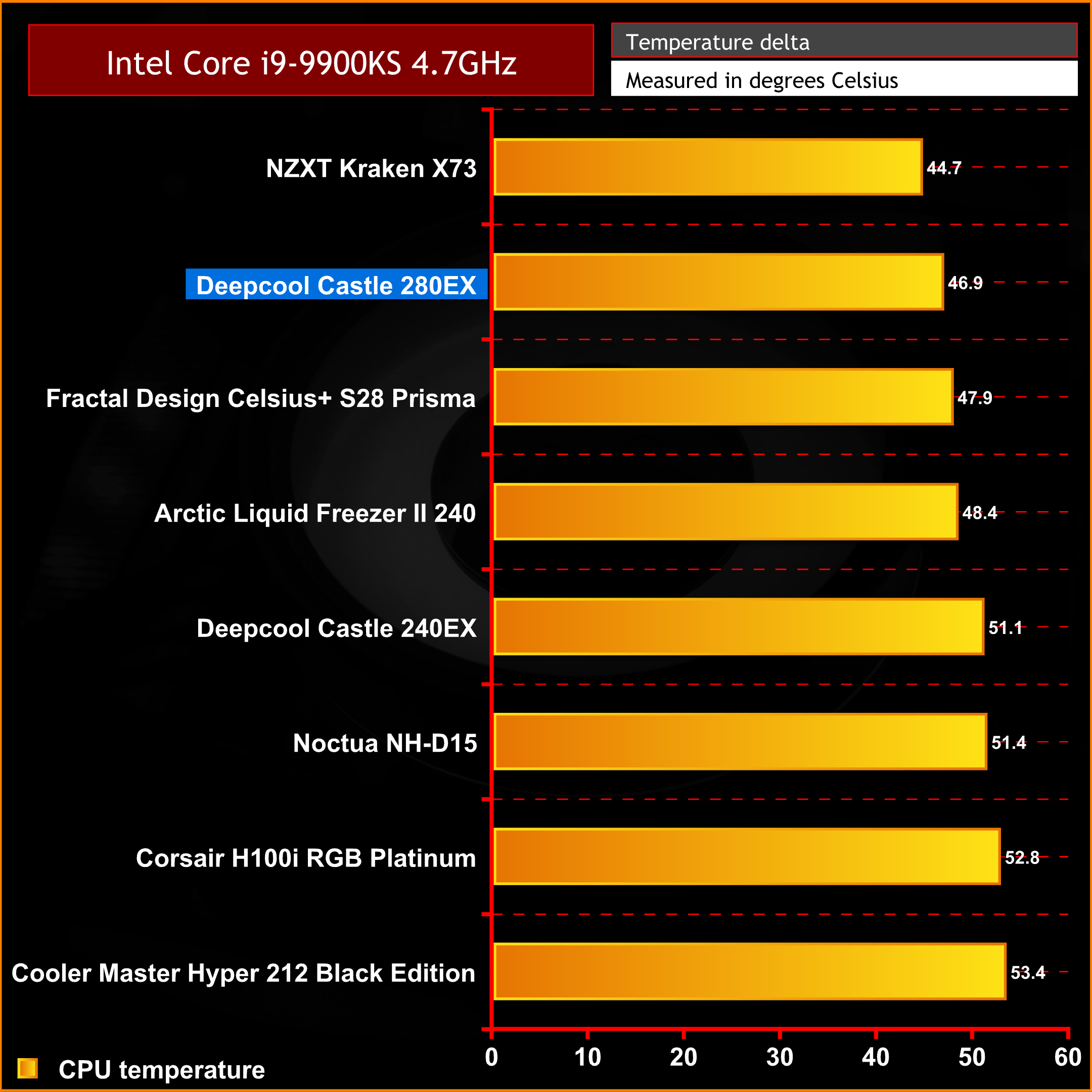 During our noise normalised test with the Intel Core i9-9900KS configured to an all-core frequency of 4.7 GHz, again the Castle 280EX performs admirably, just a couple of degrees Celsius behind the 360mm NZXT Kraken X73 which is quite impressive since this is smaller and a much cheaper AIO.