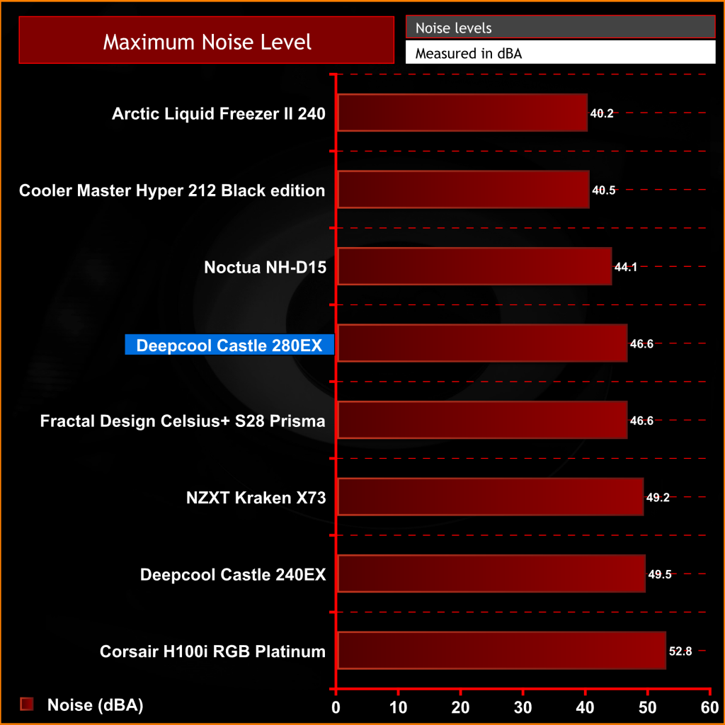 In our maximum noise level test, the Deepcool Castle 280EX sits more or less in the middle of the chart. The 46.6dBA noise output is noticeable but not too distracting and is considerably quieter than the Castle 240EX with 120mm fans. If you are not too worried about maximum noise levels then the Castle 280EX could be a worthy contender for your next build.