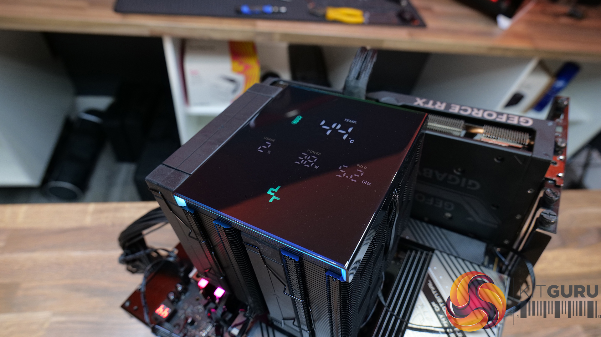 - An LCD screen mounted on top of the heatsink is enhanced to show more than just CPU temperature, it also includes power consumption, utilisation, frequency and a visual colour-coded temperature alert system. It's controlled by Deepcool DeepCreative software and requires just a single USB 2.0 header connection.