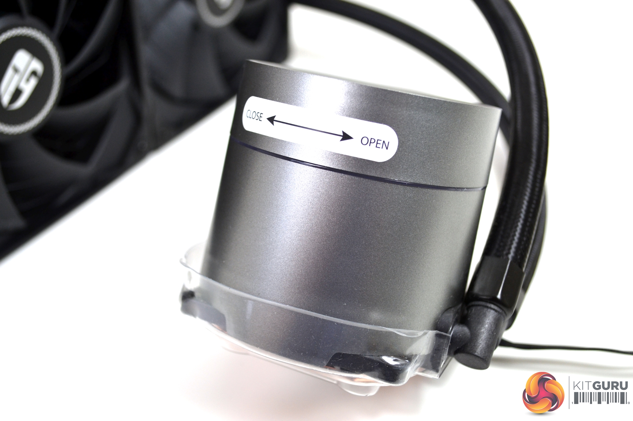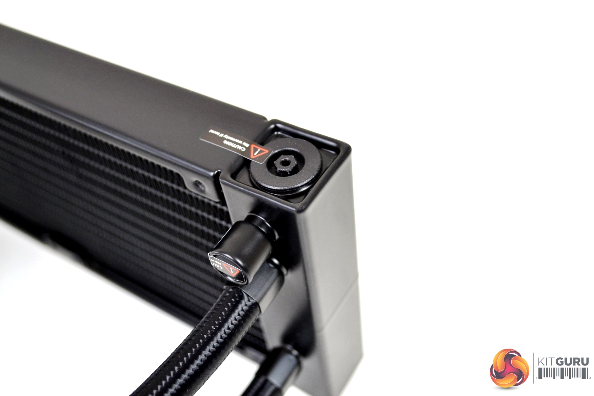 On further inspection of the cooler, we can see at the top corner of the radiator, where the anti-leak bag is located, a caution stick has been applied. Dimensions of the radiator are 282mm long, 120mm wide and 27mm deep without fans fitted – so 53mm deep with fans installed. The radiator is constructed from aluminium with a high-quality satin black finish.