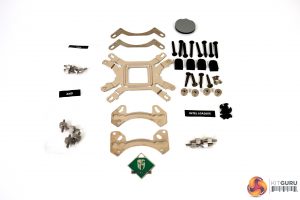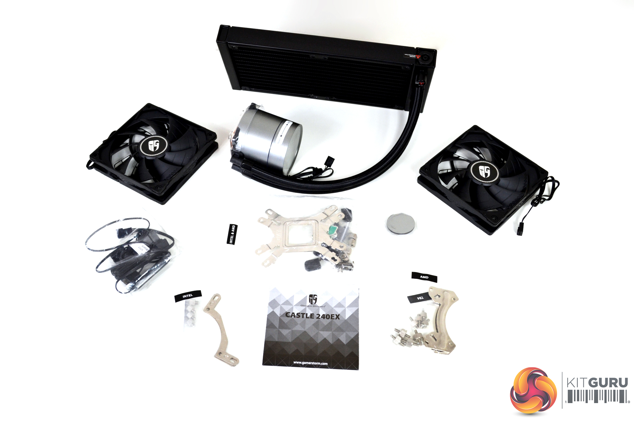 Once removed from the packaging, we can examine what is included. There is mounting hardware for current Intel and AMD platforms, including socket TR4, while we also find two TF120 S fans, which Deepcool state are specially tuned for the Castle 240EX.