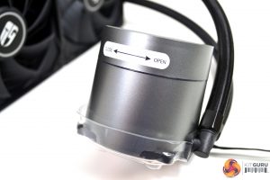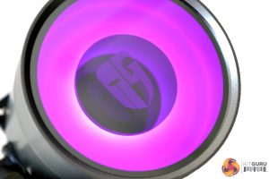 The pump assembly cuts quite an imposing figure. Its extra tall-and-wide design gives it a rather chunky look. The only RGB lighting comes from the top section of the pump, where there is a LED ring around the perimeter. Within the centre, there is a two-way mirror glass design and when power is connected, RGB lights up the glass centre to reveal a Gamer Storm logo disc beneath.