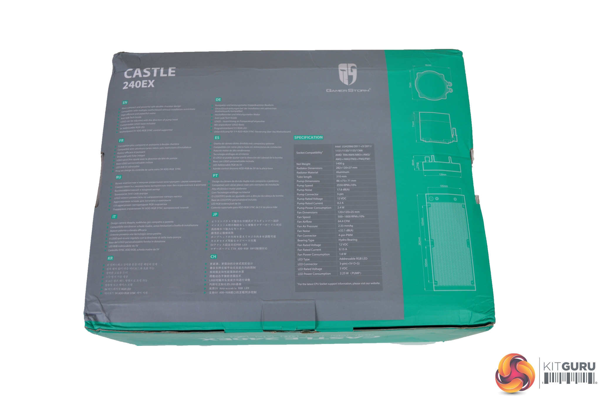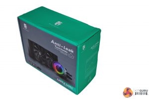 The front of the packaging shows a large image of the cooler in the centre, while the name and reference to the anti-leak technology sits on the right-hand side. A Gamer Storm logo is situated at the top left, bottom left shows compatible motherboard RGB software.