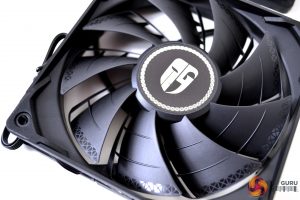 Two TF120 S fans are included with the Castle 240EX. They sport a patented two-layer fan blade design, which Deepcool say are ‘air-flow amplifying', with noise cancelling frames. The tips of the fan blades have some intricate detailing, which carries over to the sides of the fan frame. Anti-vibration rubber pads are integrated into the four corners of the fan around the mounting holes.