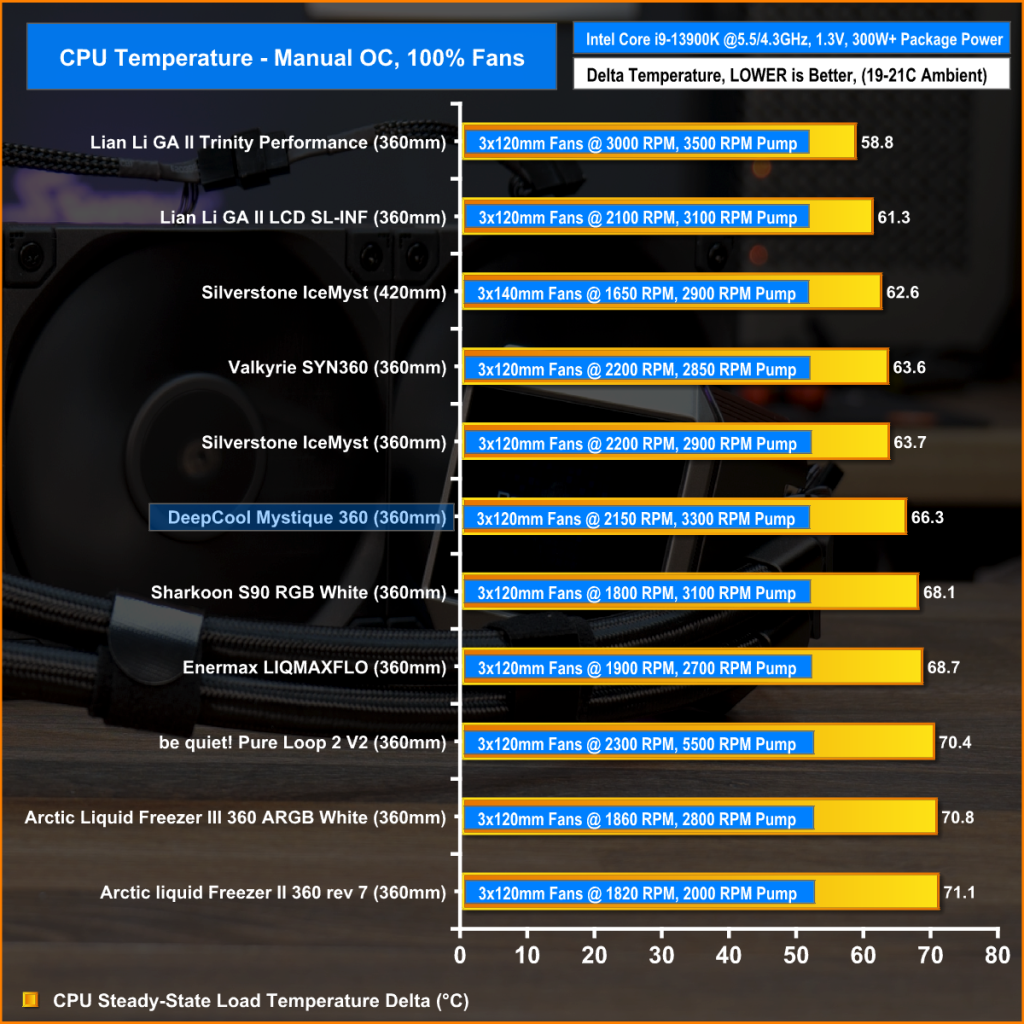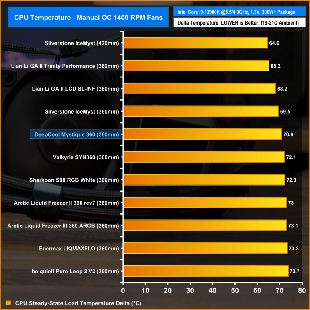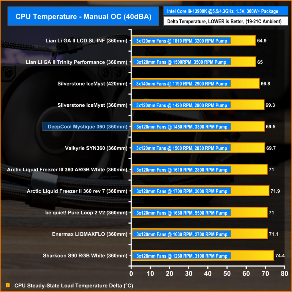 With fan speed maxed out on the 13900K the Mystique 360 performance is mid-table but solid. It beats other 360mm coolers by a close margin but it doesn’t have the brute force performance of some other coolers with high fan speed which is to be expected.