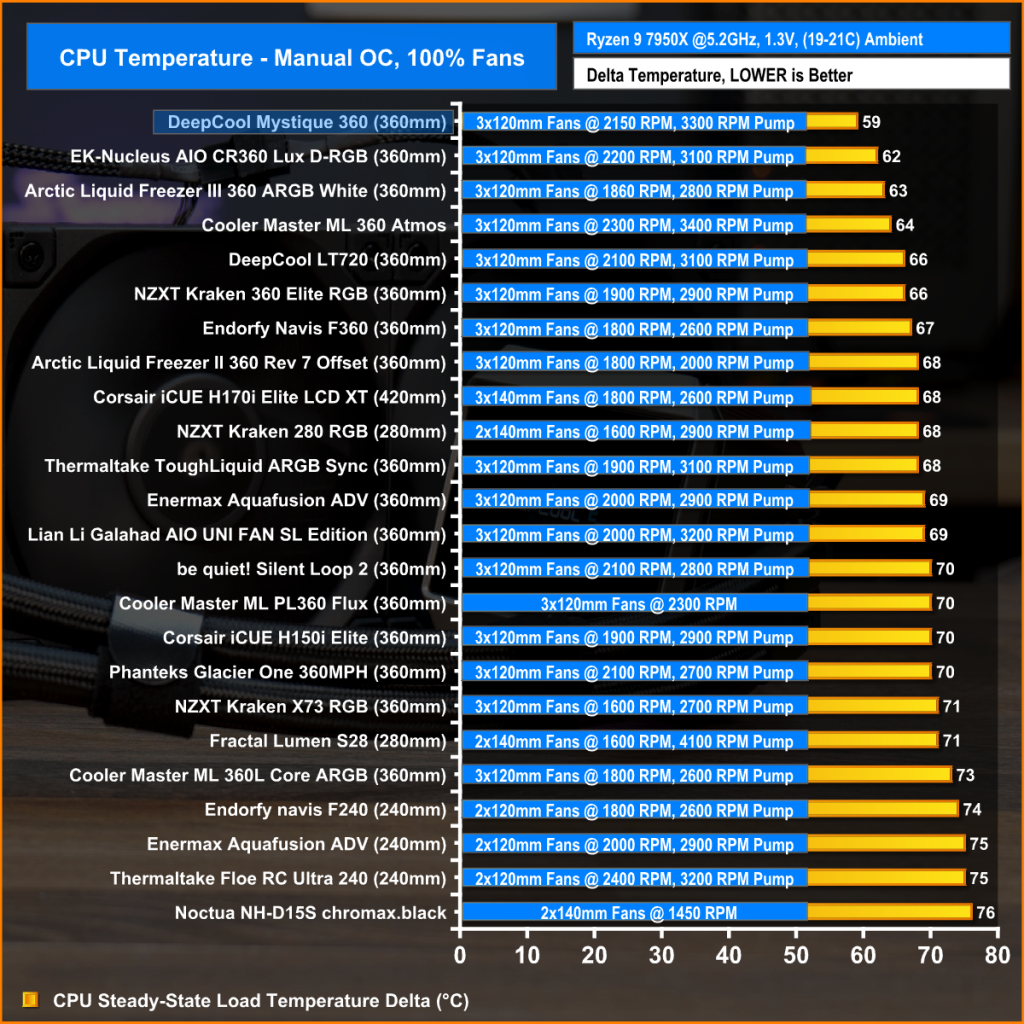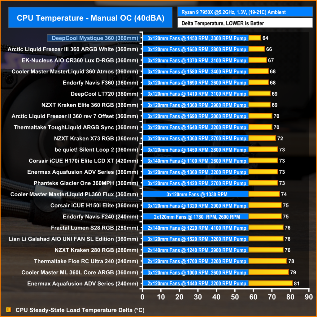 In this configuration, the DeepCool Mystique 360 shows great brute-force raw thermal performance by displacing the EK-Nucleus from the top spot in the chart by 3°C, while using an equal fan speed as the EK-Nucleus.