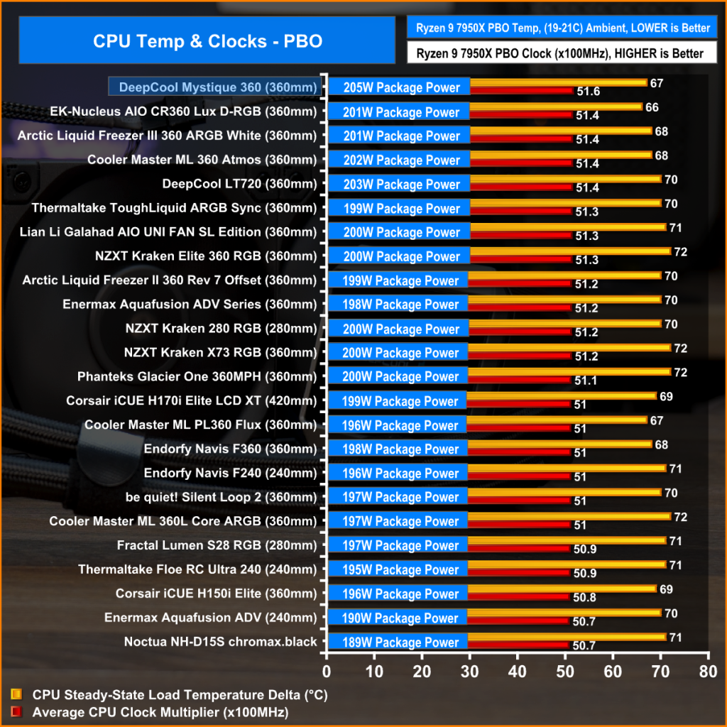 In the PBO test the important metric is clock speed. Again the Deepcool Mystique 360 scores well here with an average clock multiplier of 51.6 x which is the highest average PBO clock speed we have seen while testing the 7590X, so overall it's great performance from the Mystique 360 on AMD AM5.