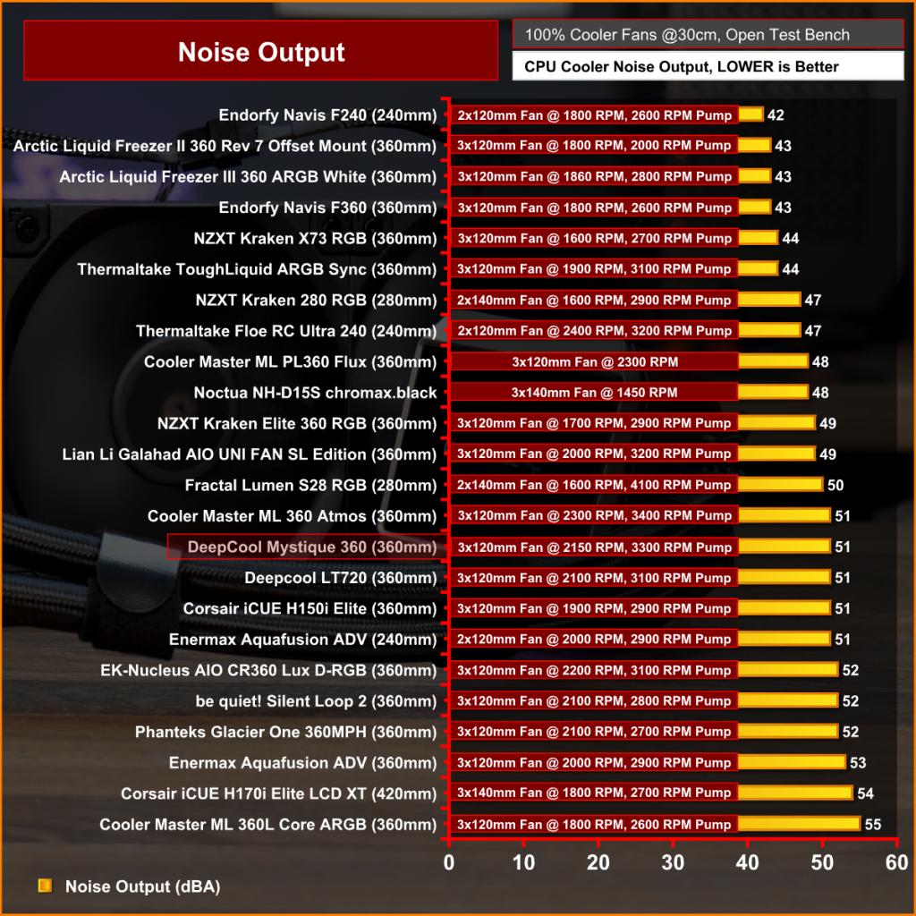 Tuning fan speed to 40dBA can harm some AIO cooler's performance, but the Mystique 360 holds on very well. In fact, at 40dBA the Mystique even outperforms the recently reviewed Arctic Liquid Freezer III by a couple of degrees.
