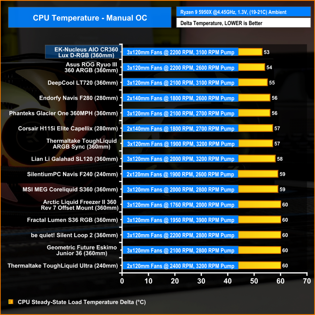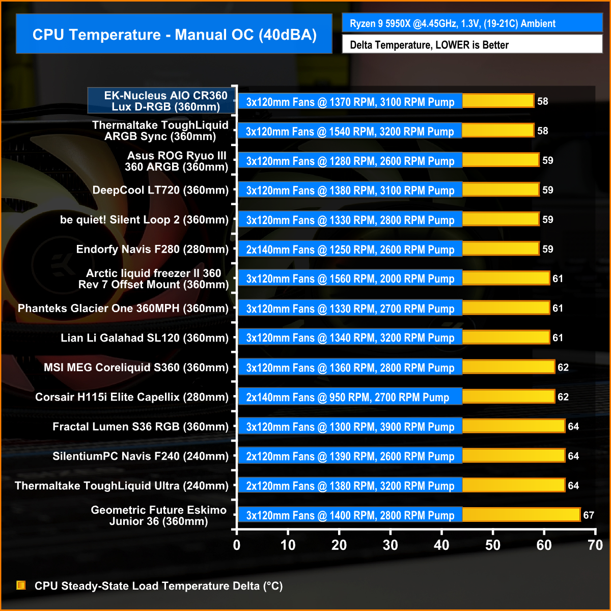 The EK Nucleus fans are tuned to produce maximum cooling performance at the expense of noise. Due to this, the EK-Nucleus CR360 Lux D-RGB performs exceptionally well in our manual OC test, with fans at maximum RPM it beats off all the competition in this test by recording an average CPU temperature of 53°C.