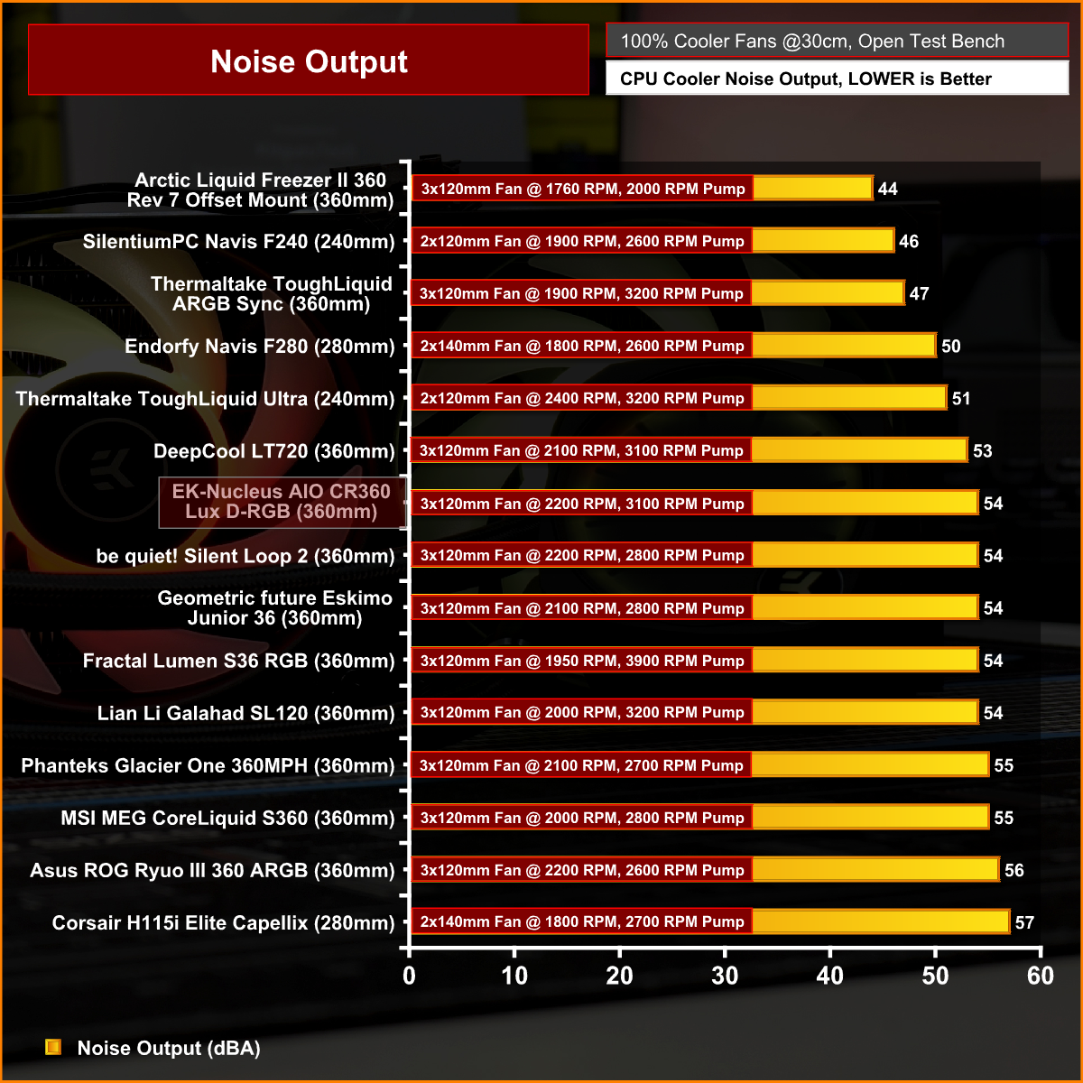With the fans running at maximum RPM the EK-Nucleus sits in the middle of our results with a maximum noise output of 54dBA. It is a little on the loud side but not out of the ordinary for a 360mm AIO. However, The Arctic Liquid Freezer II and the Thermaltake Toughliquid ARGB Sync are the exceptions to that rule.