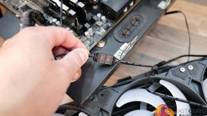 The last stage of the hardware installation is wiring. Connect the 4-pin PWM cable from the CPU block to a motherboard fan header (usually labelled CPU-OPT or AIO/PUMP) then connect the 4-pin PWM cable from the fans to the CPU_FAN header for motherboard speed control.