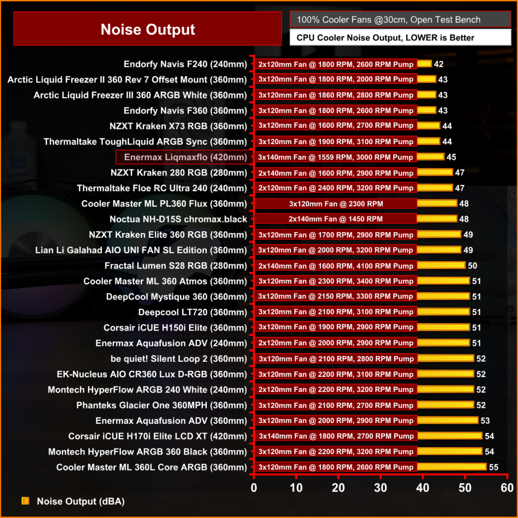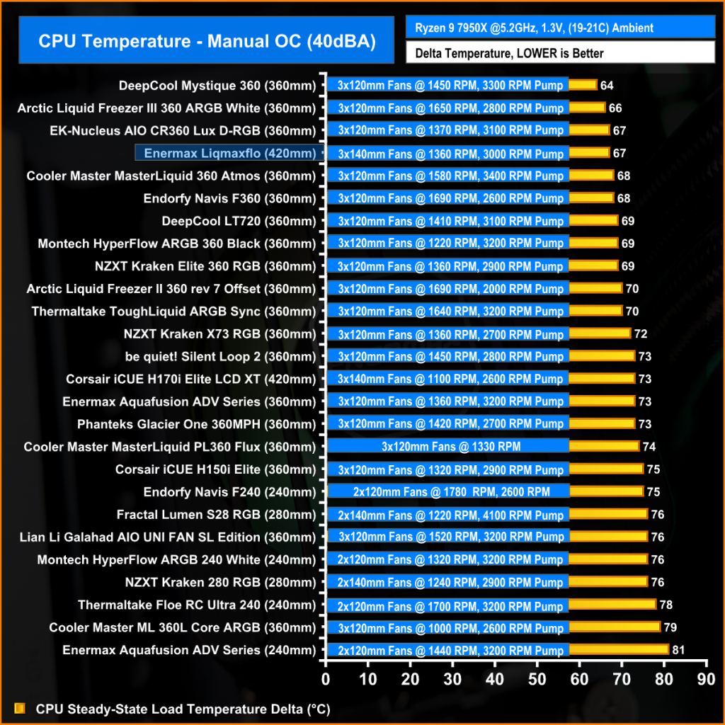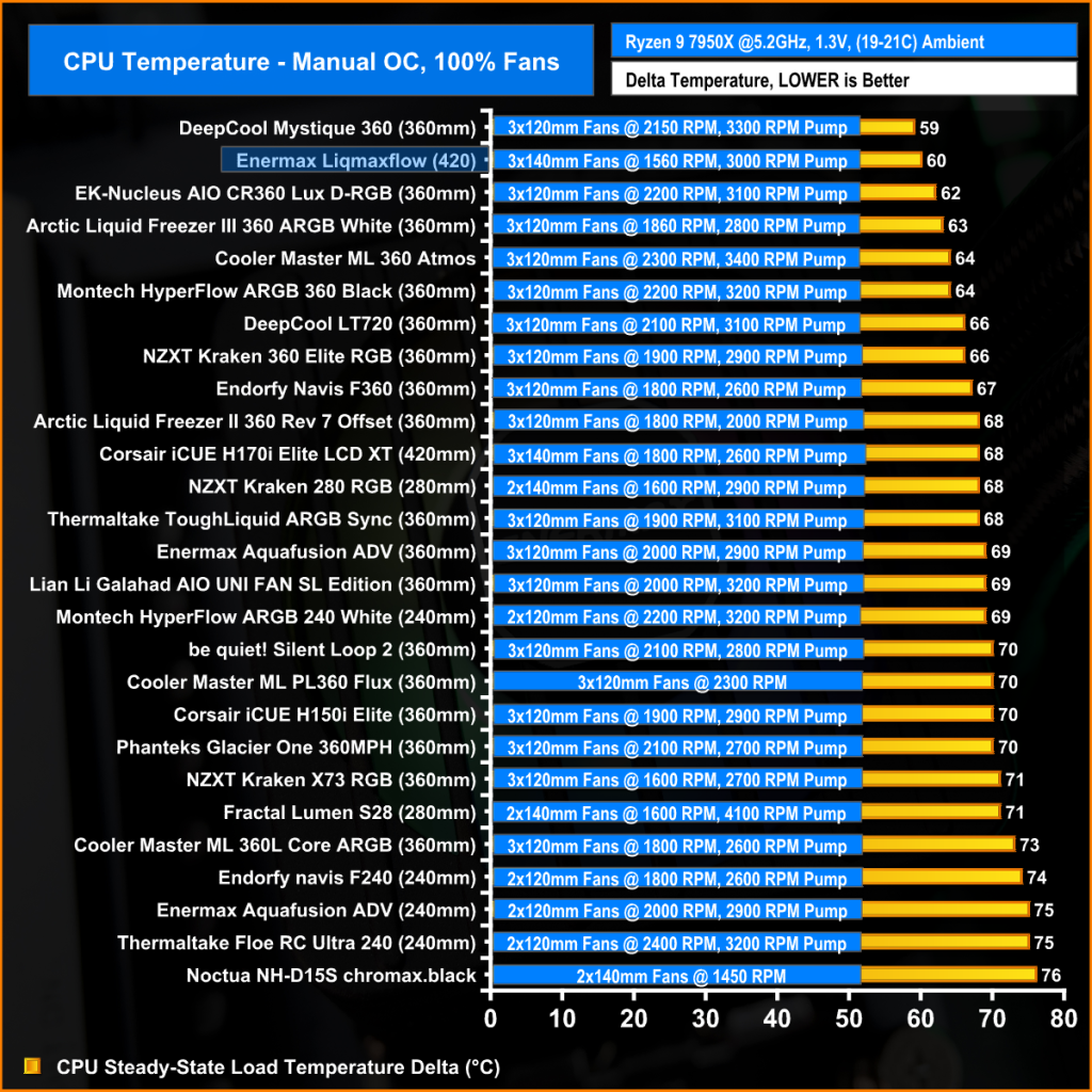 The surface area of the 420mm radiator shows its strength here. With the fans at maximum RPM, the Enermax Liqmaxflo 420 produces excellent thermal performance, only beaten by the DeepCool Mystique 360 which has much faster running 120mm fans but a smaller radiator and is significantly louder than the Liqmaxflo.