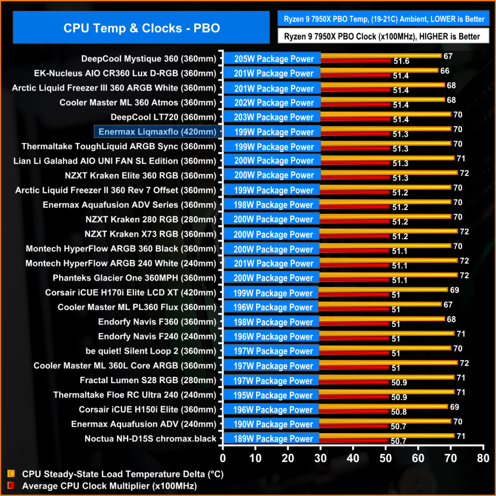 The PBO performance of the Liqmaxflo 420 is also very solid. It's able to hold an average clock multiplier of 51.3X while the average CPU delta is at 70°C, all while cooling 199W package power which means it sits just out of the top 5 but performance at the top is extremely close in this test, so overall it's a good effort from Enermax.