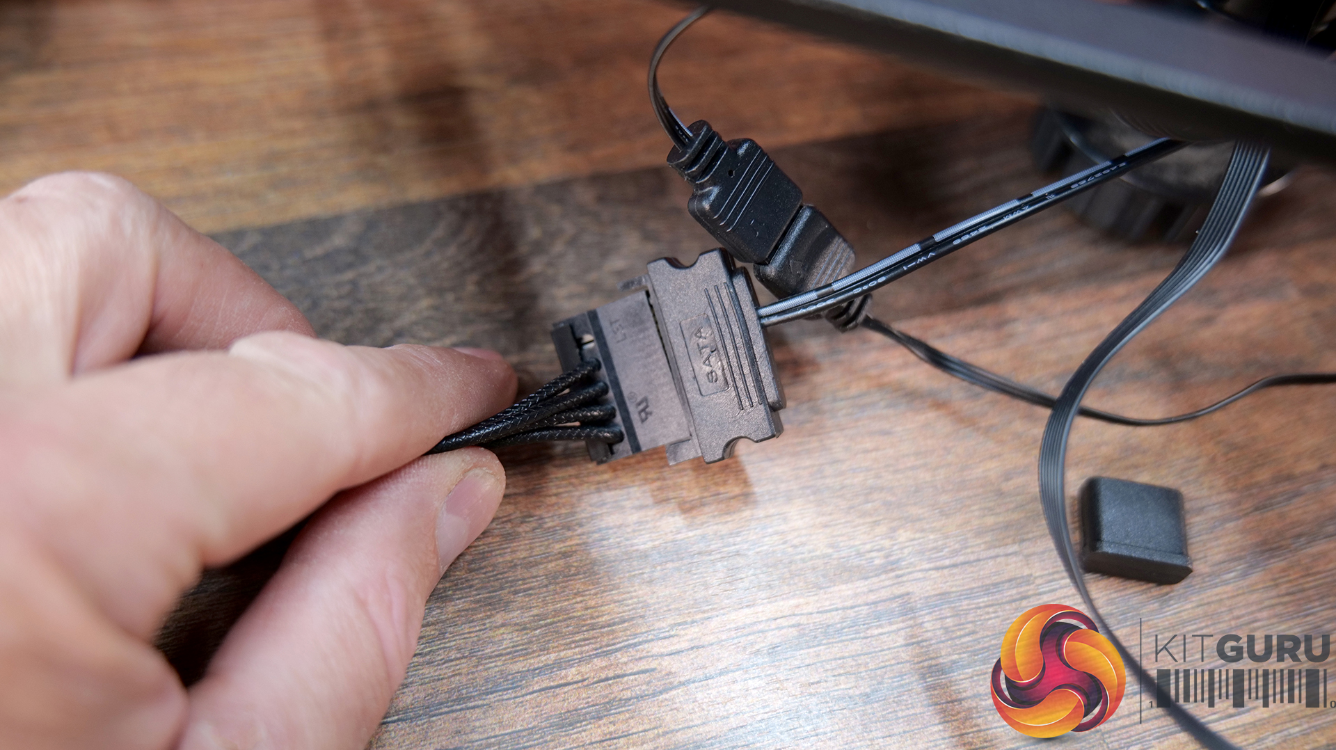 Then connect 3-pin ARGB cables in a daisy chain between the fans and CPU block, connect the female end to a motherboard 3-pin 5V ARGB header. The SATA power connector from the LCD screen needs to be connected to a spare SATA power from the power supply.