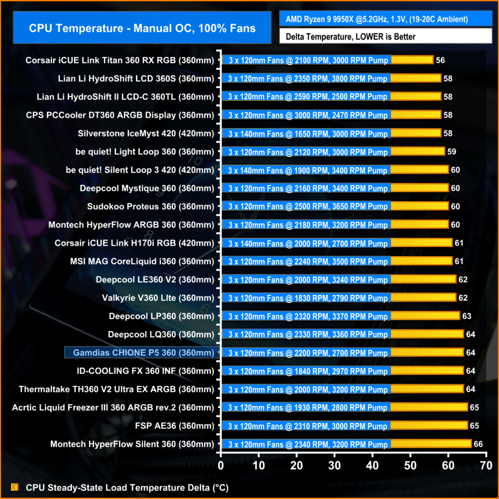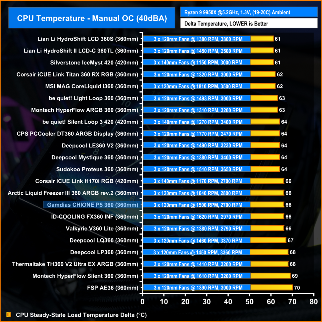 Reducing the coolers fan speed to hit the 40dBA noise target puts them all on a level playing field and we can determine the true thermal performance. Again the Gamdias CHIONE P5 360 isn't the best at 66°C over ambient but at this temperature, the heat produced by the AMD Ryzen 9 9950X is under control, it's not overheating or throttling frequency, which is a positive note for a budget LCD clad cooler.