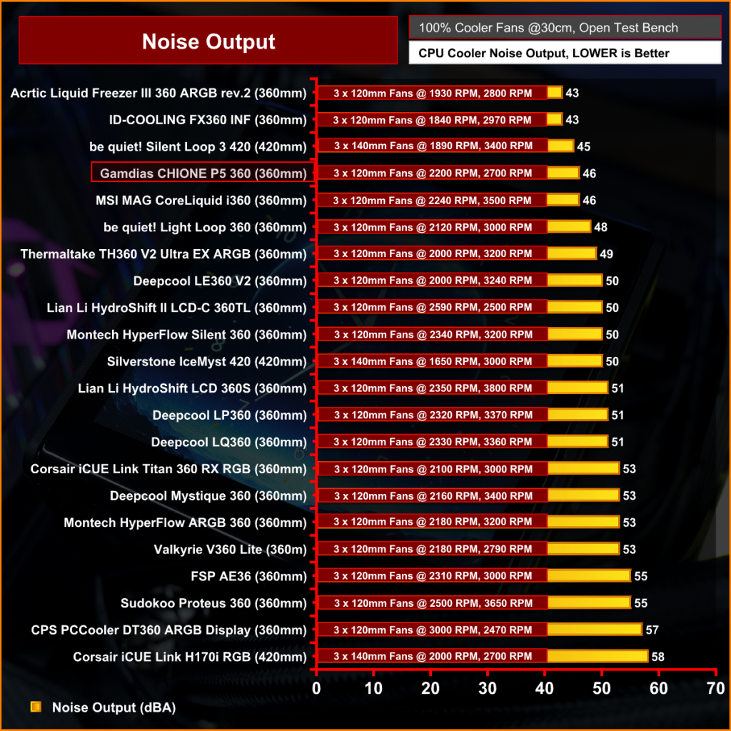 At 46dBA max the Gamdias CHIONE P5 360 is one of the quieter coolers that we have tested. It's not as quiet as the Arctic Liquid Freezer III 360, but it certainly won't be too distracting at max fan speed like some of the louder coolers running at over 50dBA.
