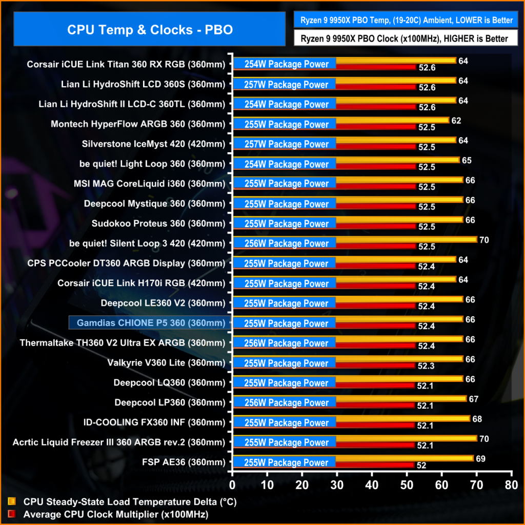In the PBO test the important metric is clock multiplier as the CPU frequency is automatically adjusted to meet a target temperature so the dalta between coolers is narrow. It's not a bad showing from the Gamdias CHIONE P5 360 in the PBO test, it's trading blows with the competition by maintaining an average 52.4x clock multiplier, which is a decent result from this lesser-known brand.