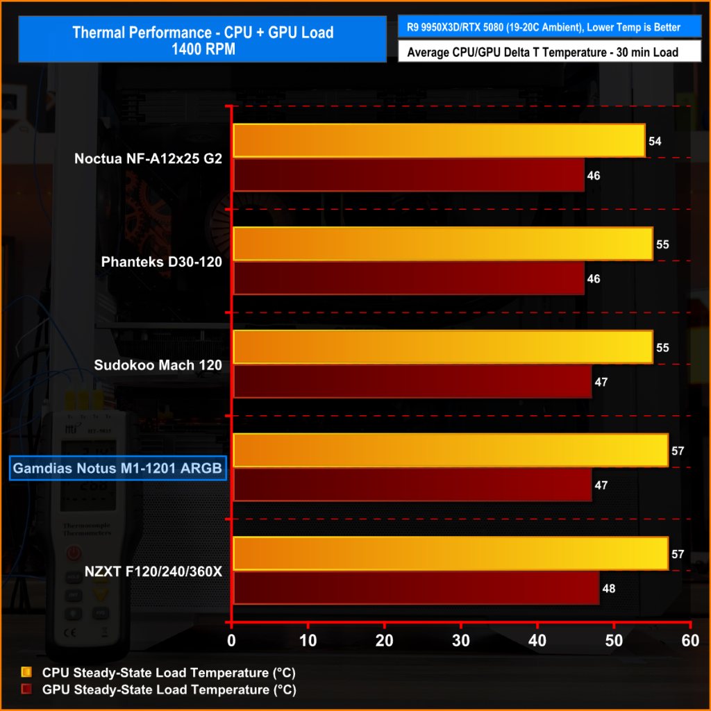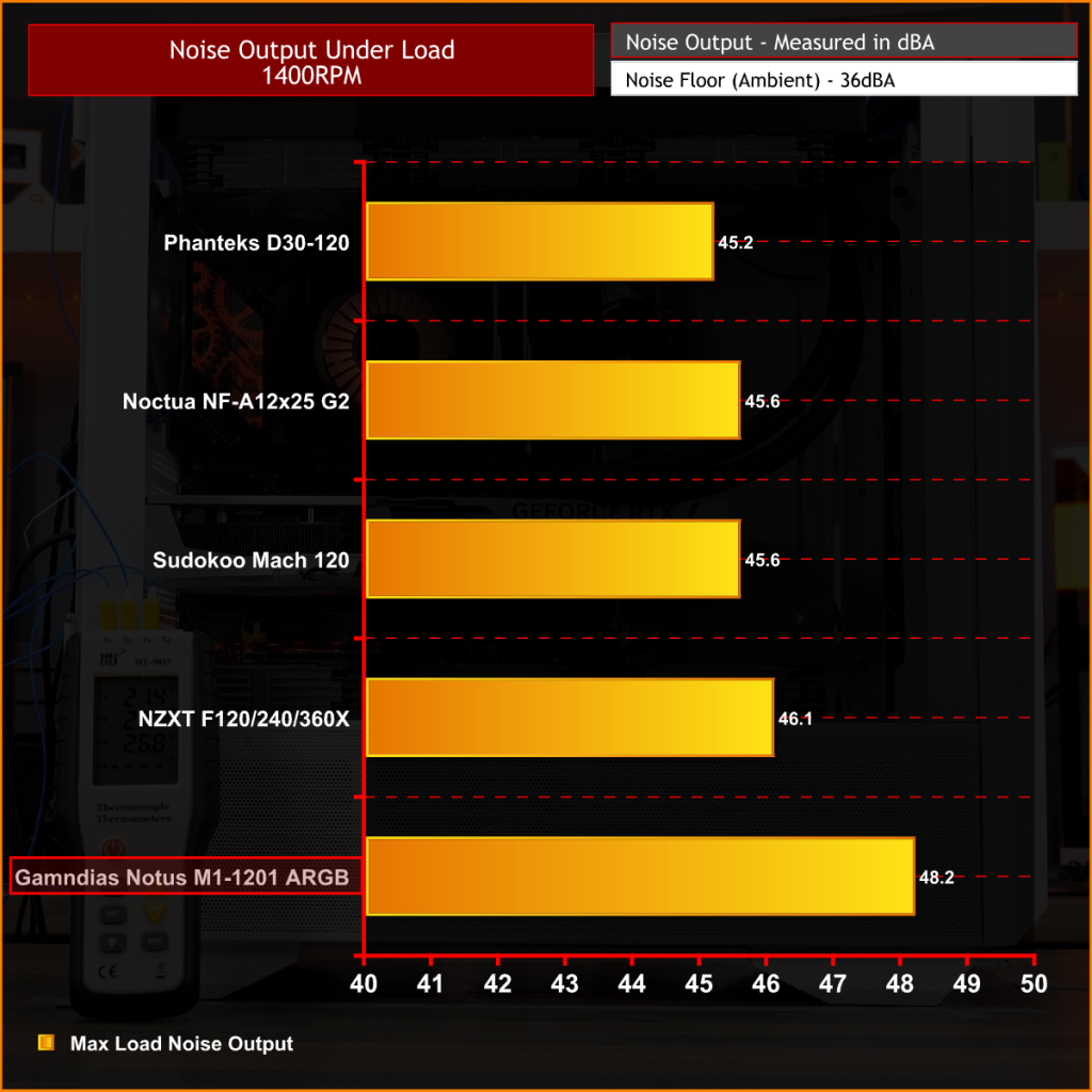 With all fans running at 1400 RPM, the Notus M1-1201 ARGB posts a CPU temperature of 57°C and a GPU temperature of 47°C over ambient. Putting it slightly behind the Noctua, Phanteks, and Sudokoo fans, but on par with the NZXT F120X. The Notus M1 is able to keep temperatures under control at 1400 RPM, but don’t forget they are running louder than the others at this RPM-normalised speed.