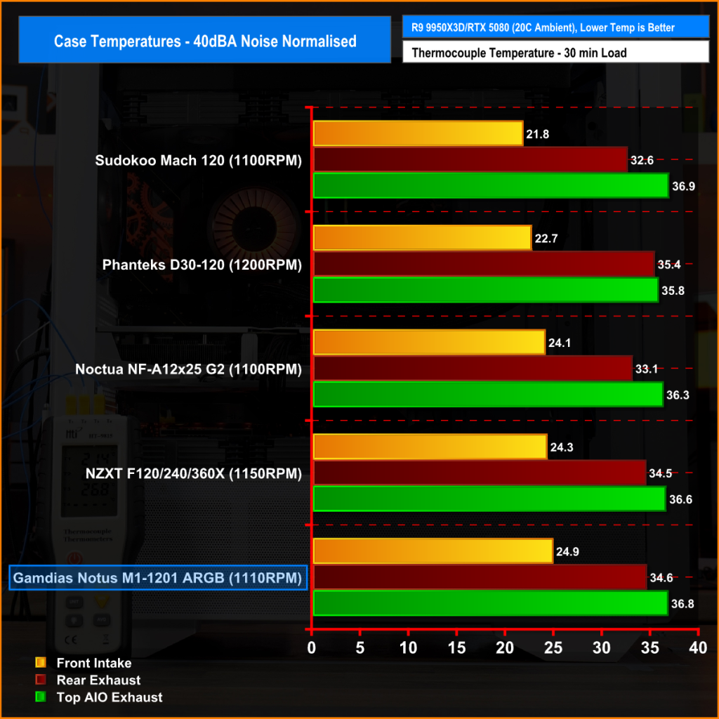At 40 dBA the Notus M1-1201 ARGB performance drops off compared to the more efficient fans. Front intake sits at 24.9°C, noticeably higher than the Phanteks and Sudokoo options, while rear exhaust and top AIO exhaust hit 34.6°C and 36.8°C. It’s not the coolest in this noise-normalised mode, but the temperatures are still reasonable, showing that the fan can run quietly without letting case temperature get out of hand.