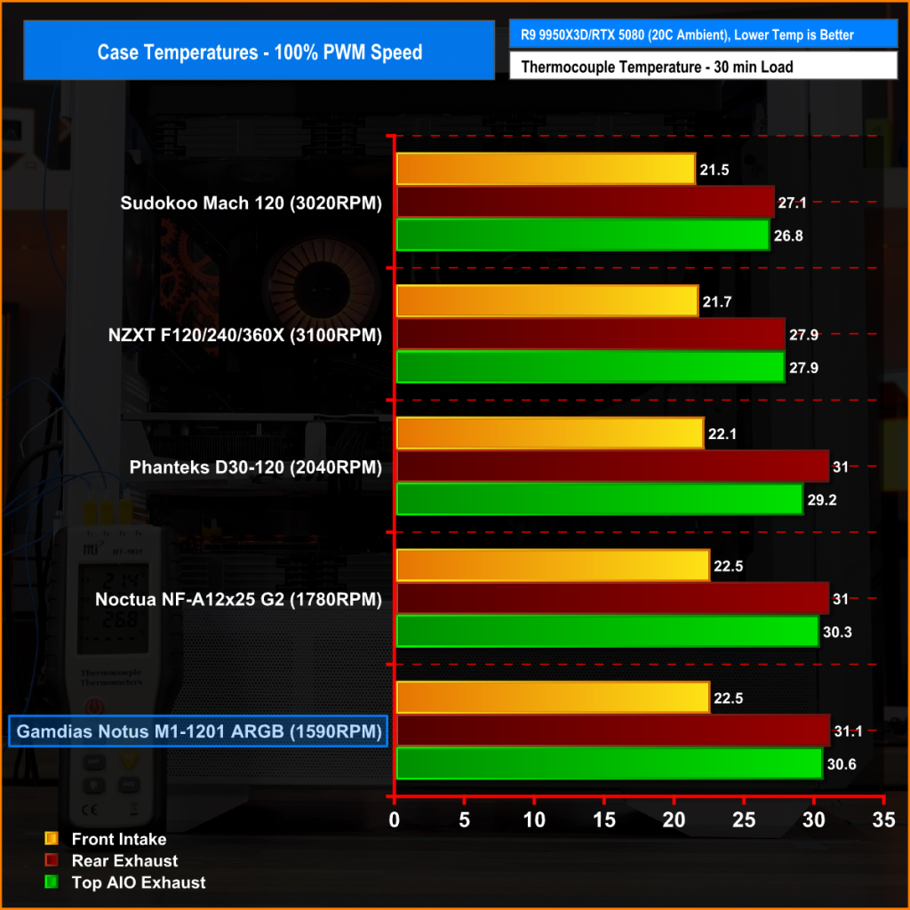 With all system fans running at full speed, the Notus M1-1201 ARGB produces a solid result, especially considering its lower 1590 RPM limit. At the front intake, it matches the Noctua NF-A12x25 G2 at 22.5°C and sits a little behind the much faster Sudokoo and NZXT fans. It’s a similar story for top and rear temperatures, where it stays close to the Noctua and Phanteks but trails the faster-running fans of NZXT and Sudokoo here.