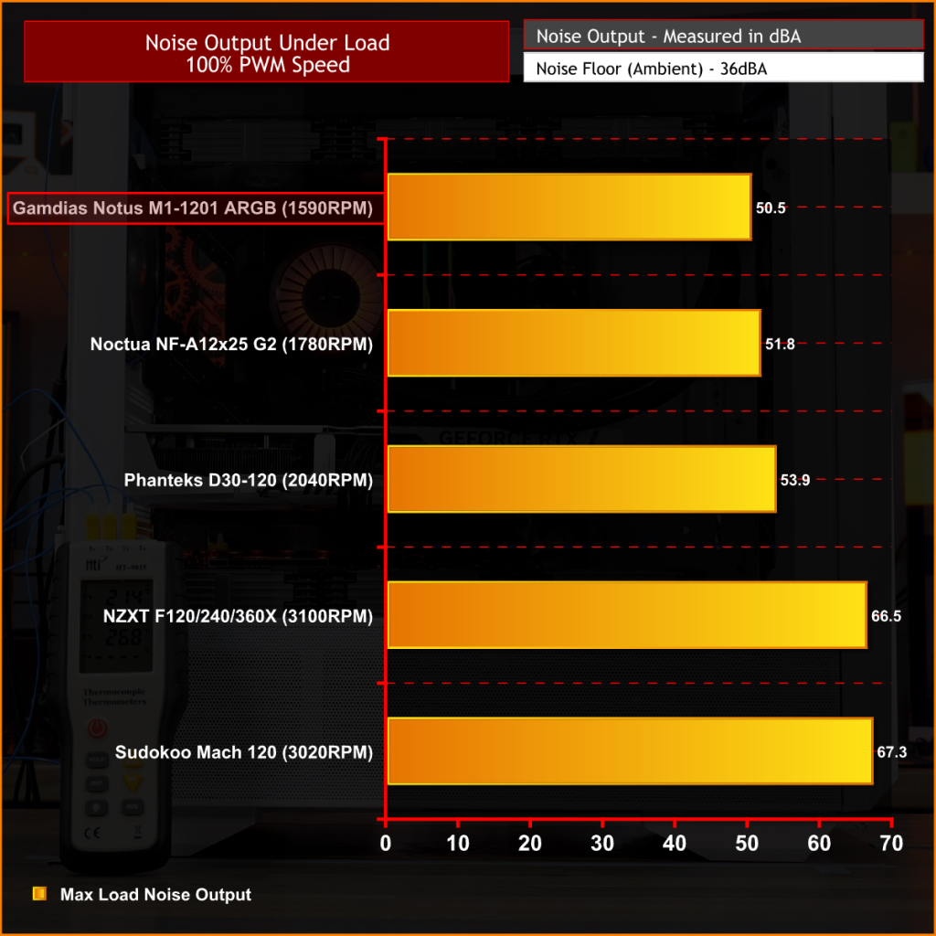 At max RPM, the Notus M1-1201 ARGB peak noise is 50.5 dBA, at just under 1600 RPM, which is a good result. It comes in slightly quieter than the Noctua NF-A12x25 G2 and Phanteks D30-120, while sitting well below the high-RPM options from NZXT and Sudokoo. Gamdias has chosen sensible acoustics rather than high RPM and the result is a fan that remains relatively quiet even when running flat out.