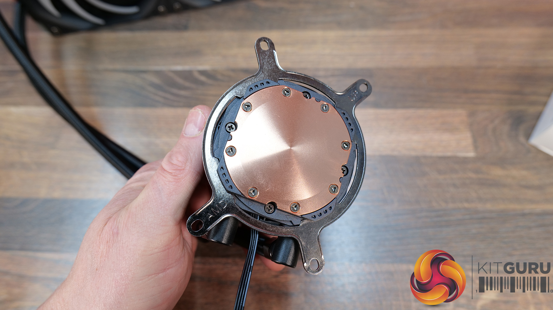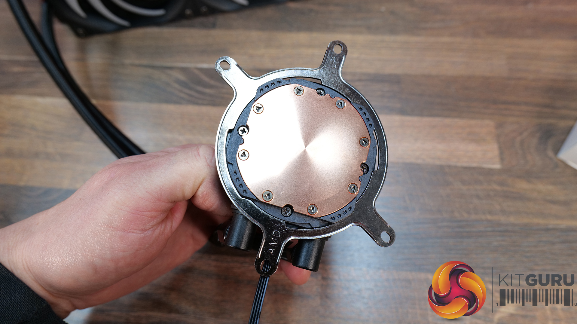 Select the correct upper CPU block mounting brackets for your hardware, ours is AMD. Fit the upper bracket to the CPU block housing; it is attached in a twist-to-lock motion similar to a bayonet-type fitting.