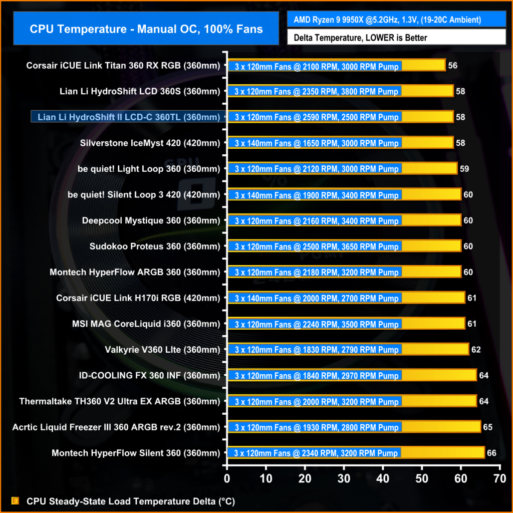 In this scenario the Lian Li HydroShift II LCD-C is again at the top end of our chart with an average clock multiplier of 52.6x while cooling over 250W package power. It matches the performance of its predecessor and outperforms the 420mm Silverstone unit. So even though the radiator dimensions have been slimmed down, there's no reduction in performance, which is very impressive.