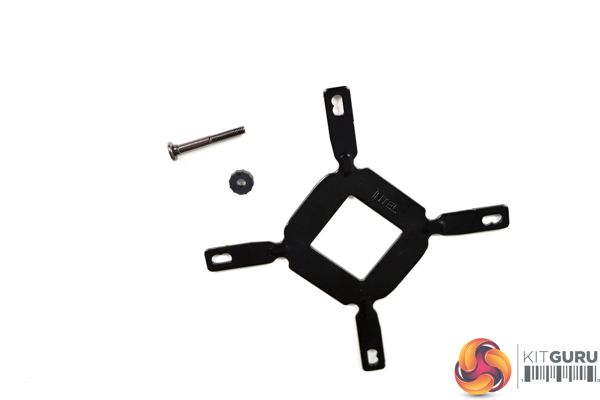 Next up is the preparation of the motherboard. For Intel 115x platforms, select the relevant Intel specific backplate, standoffs and retention washers. Push the nickel-plated standoffs through the holes that correspond to 115x on the backplate and secure the standoffs to the backplate using the plastic retention washers.