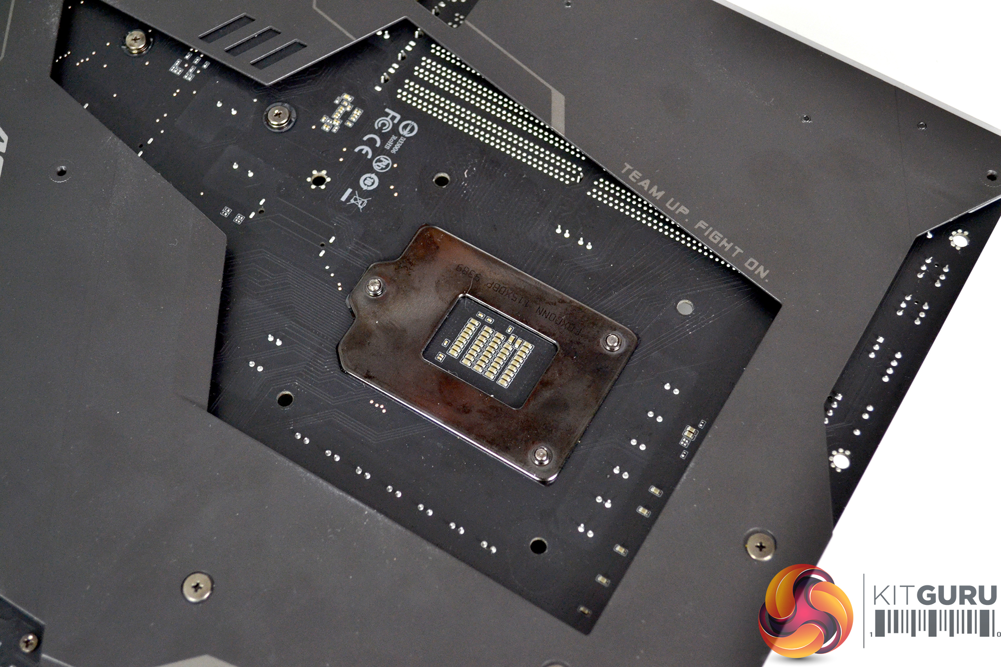 Now working from the back of the motherboard, align the backplate standoffs with the motherboard mounting holes and drop the assembled backplate into position before turning the motherboard back the correct way up.