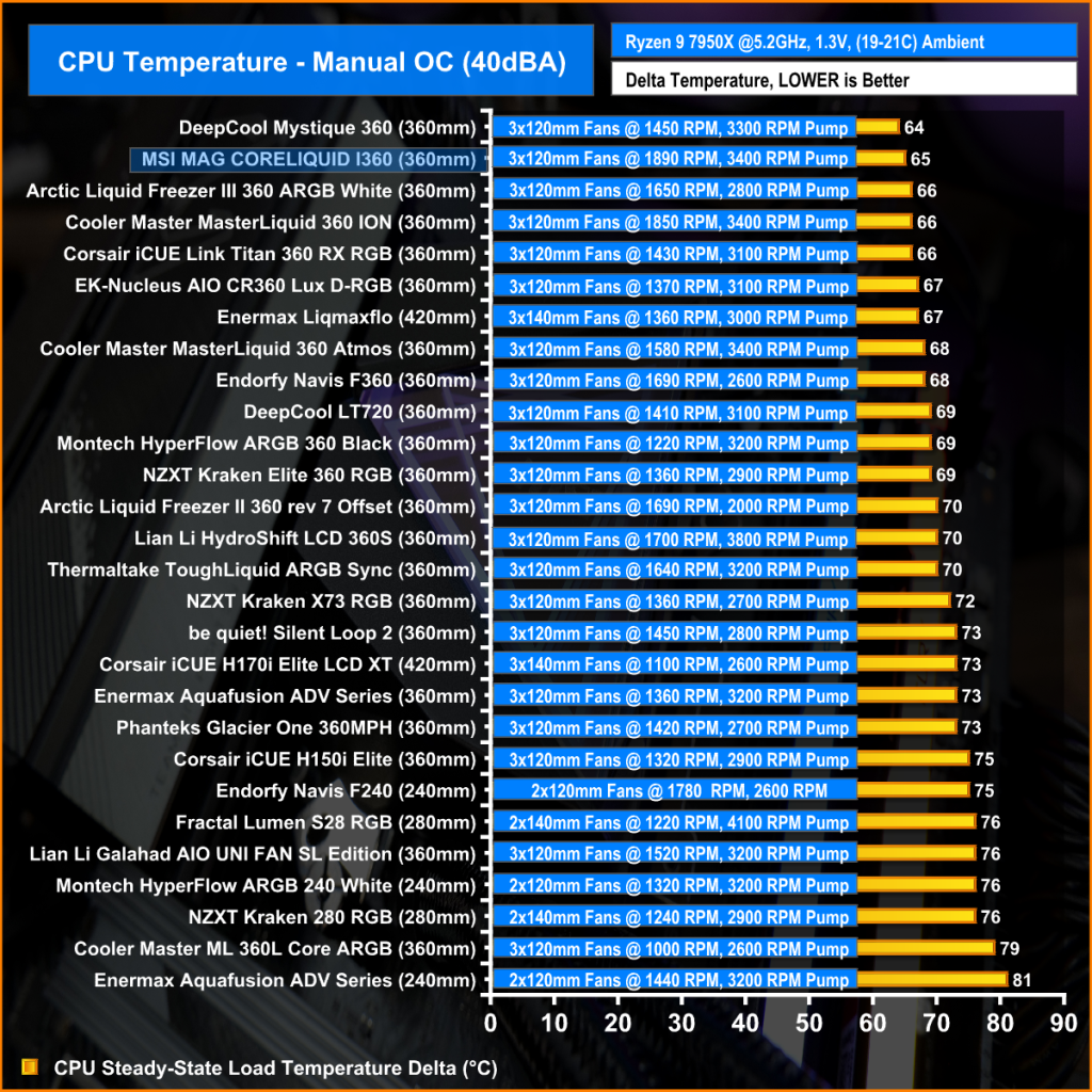 With fans running at max RPM the performance of the CoreLiquid I360 is up there with some of the top performers that we have tested previously on the 7950X. 64°C over ambient is a very respectable score, so at max fan speed the cooler has great performance.
