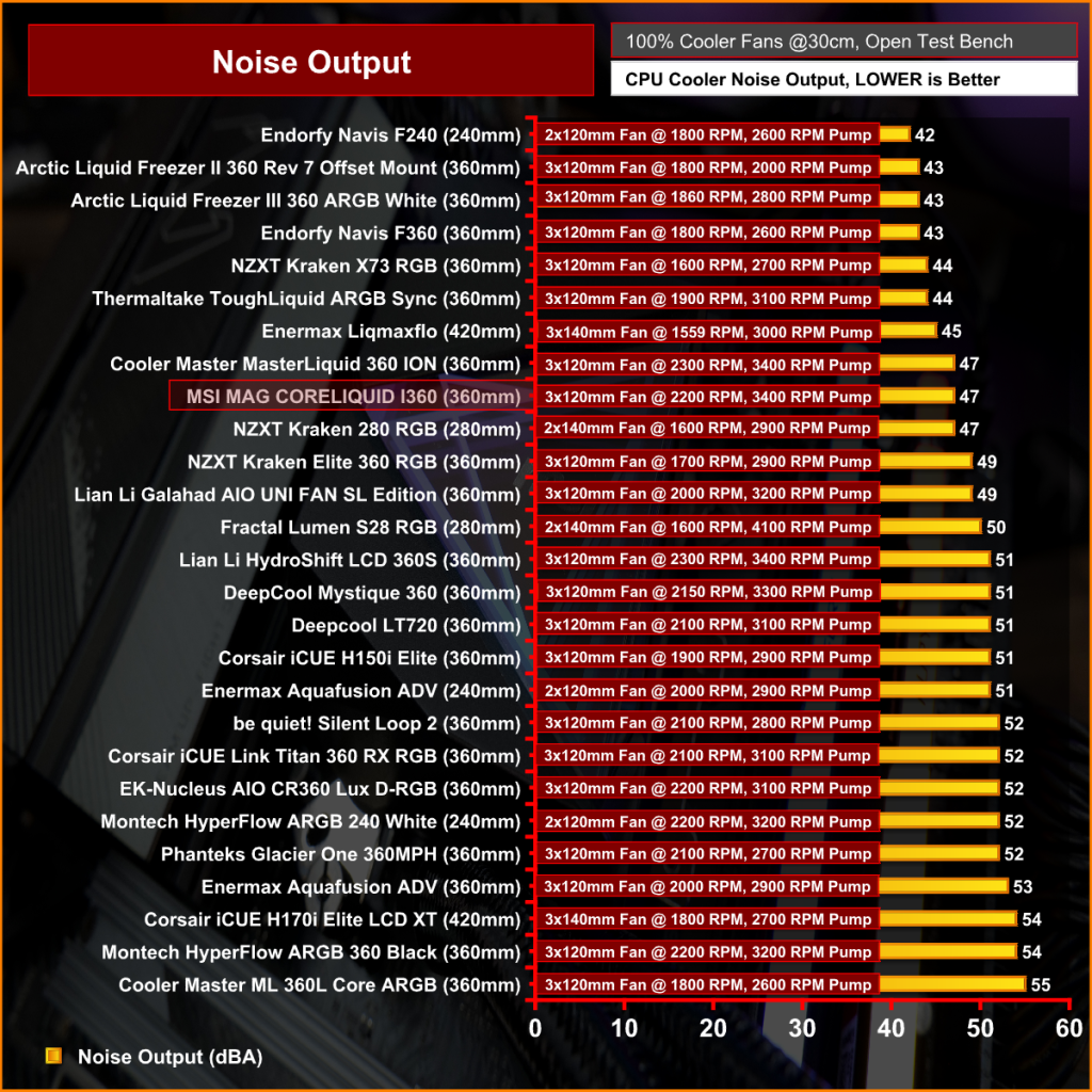 With fans running at maximum speed the MSI MAG CoreLiquid I360 is one of the quieter 360mm AIO that we have tested. 47dBA max noise output at 2200RPM is quite impressive.