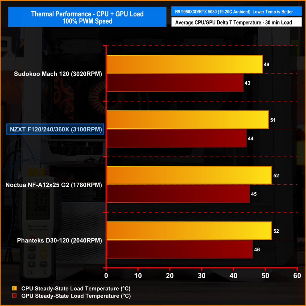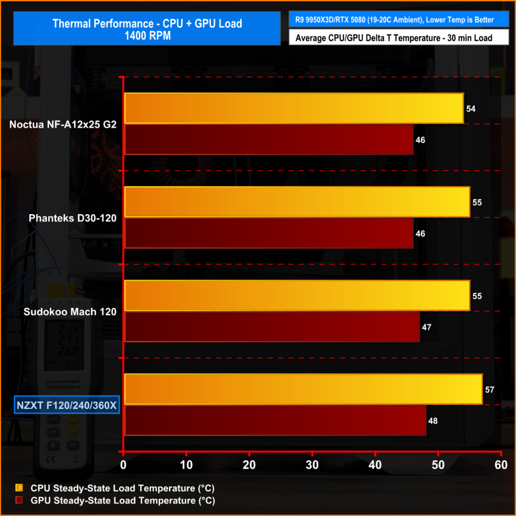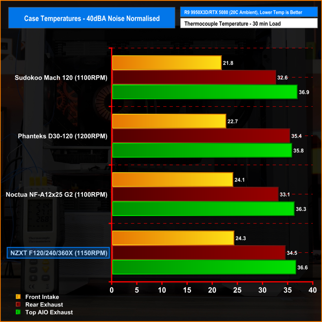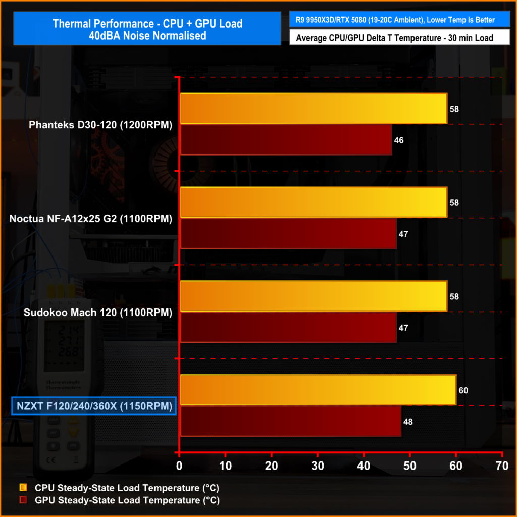 Our testing focuses on the thermal performance of each fan under three conditions: 100% PWM, 1400 RPM, and 40 dBA noise-normalised operation. All tests are conducted with a manual CPU overclock, locking the all-core frequency and VCORE to ensure consistent load across runs.