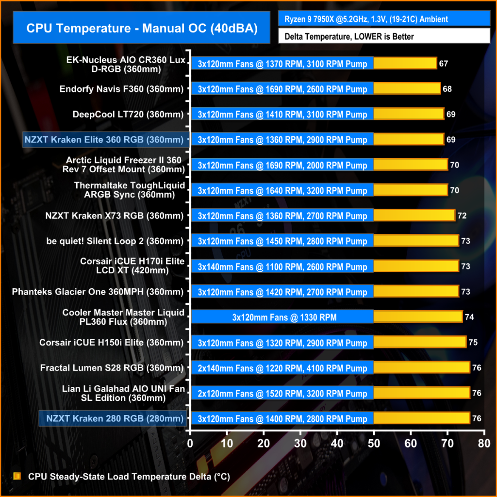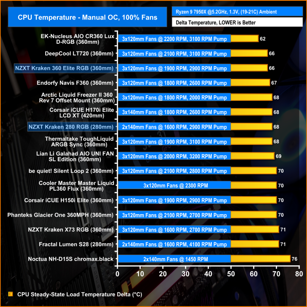 Sticking with fans at maximum RPM, in this configuration the Kraken Elite 360 performs very well, keeping the 7950X average delta temperature at 66°C which places the Kraken Elite 360 in the top three of our chart, the Kraken 280 isn’t far behind either with an average CPU temperature delta of 68°C.